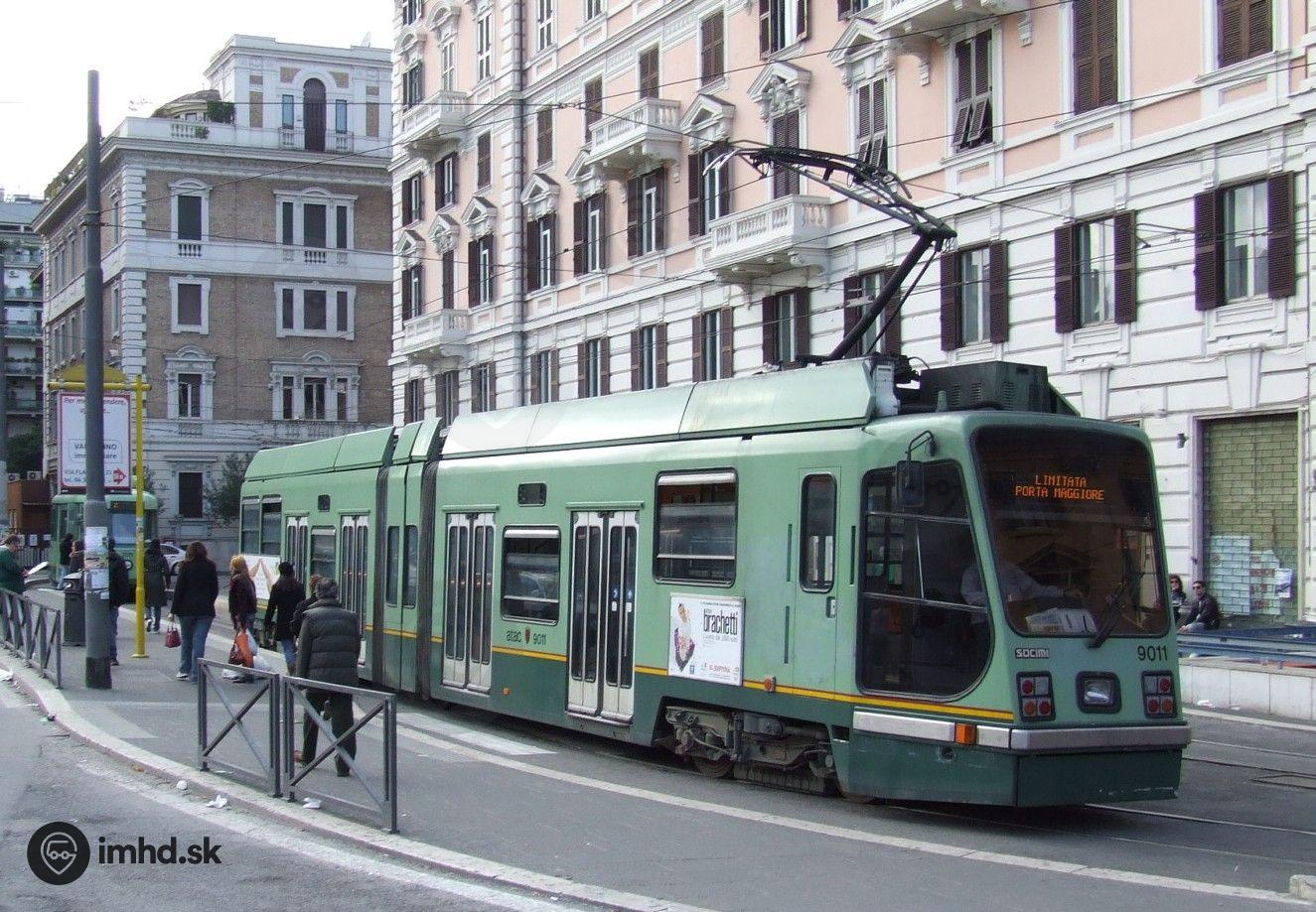Električka Socimi #9011 odchádza zo zastávky Piale Flaminio. Vozidlá tohto typu dodané v roku 1990 boli prvými novými električkami v Ríme od roku 1956.