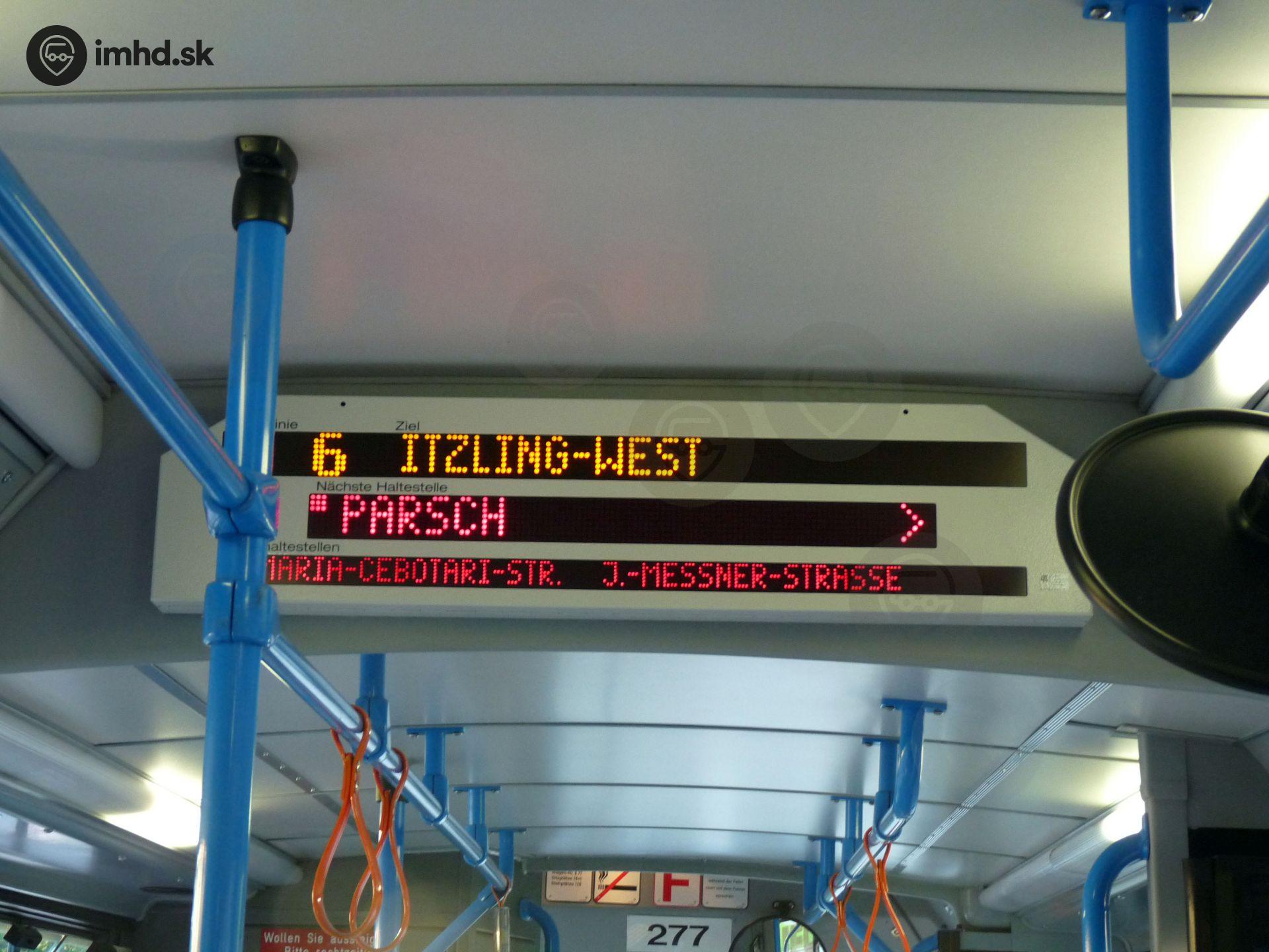 Vnútorný informačný systém v prednej časti trolejbusu Van Hool AG300T zobrazuje konečnú, nasledujúcu zastávku a trasu.