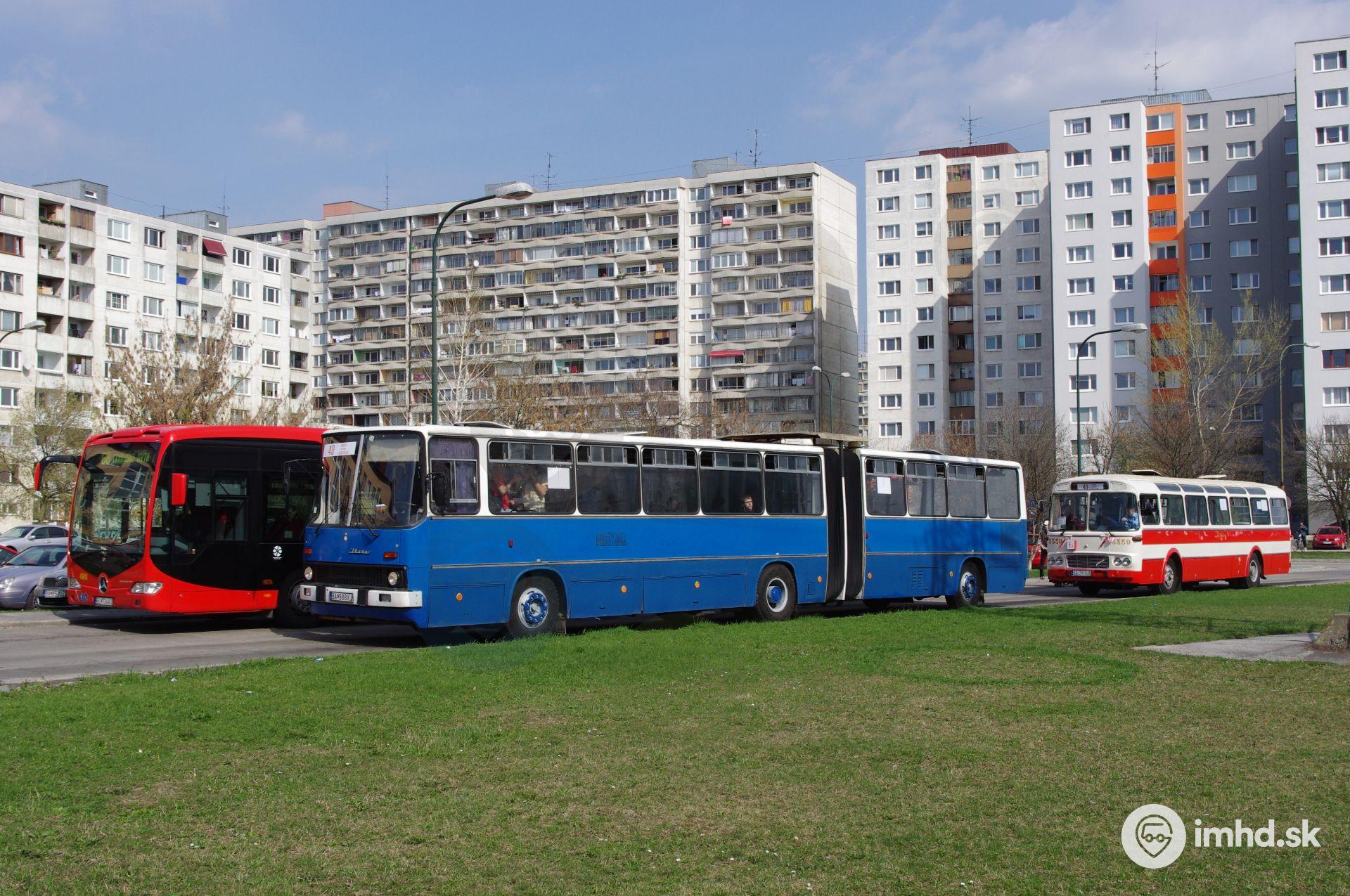 Zaujímavé stretnutie troch autobusov rôznych typov, usporiadaných od najkapacitnejšieho (vľavo) po najmenej kapacitný, počas jazdy k 40. narodeninám expresných liniek v Bratislave.