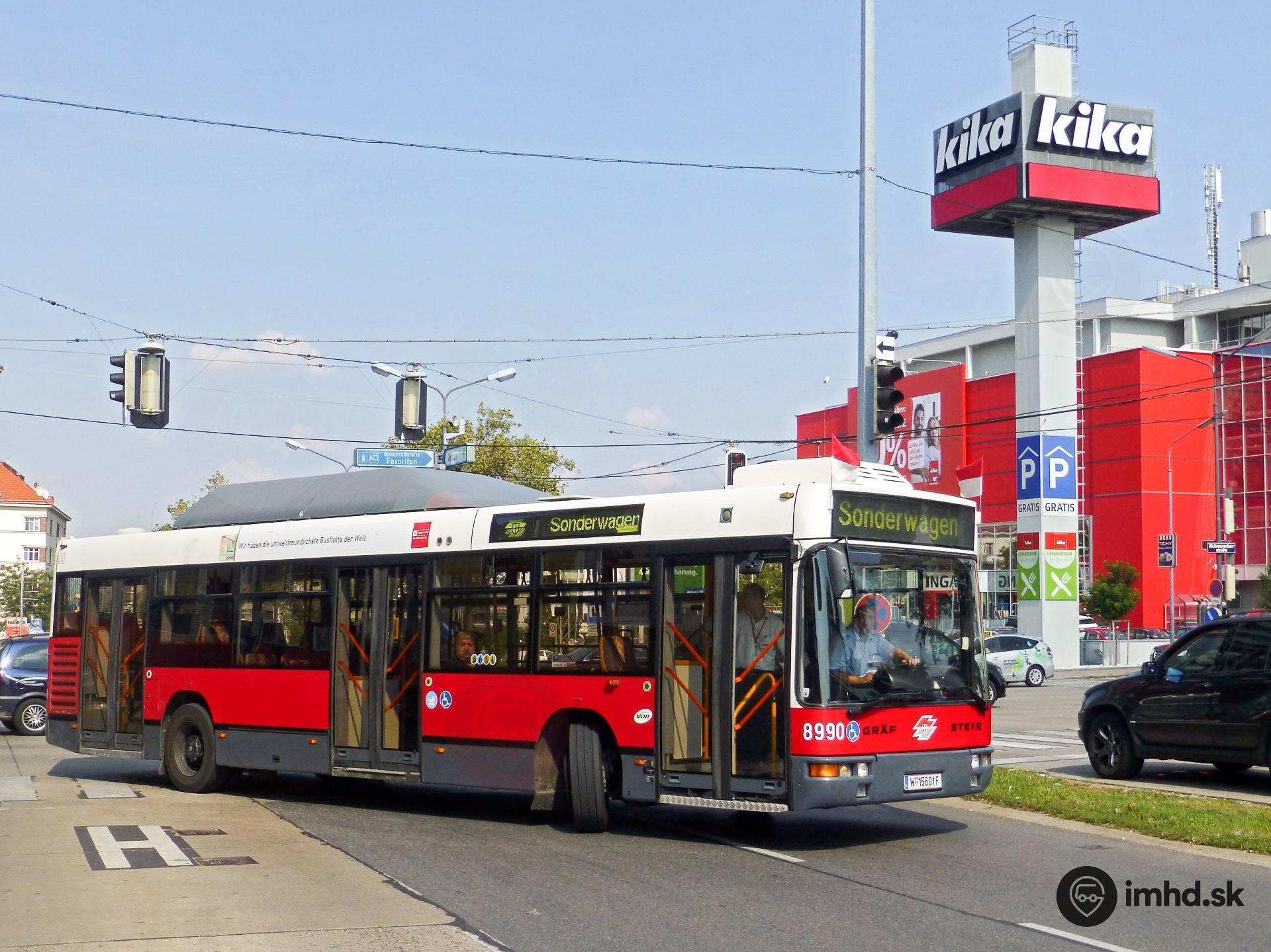 Historický nízkopodlažný autobus Gräf und Steyr NL 205 M12 #8990 prichádza ku zastávke Laxenburger Straße/Raxstraße, odkiaľ povezie záujemcov o zvezenie ku stanici Wien-Meidling a naspäť.