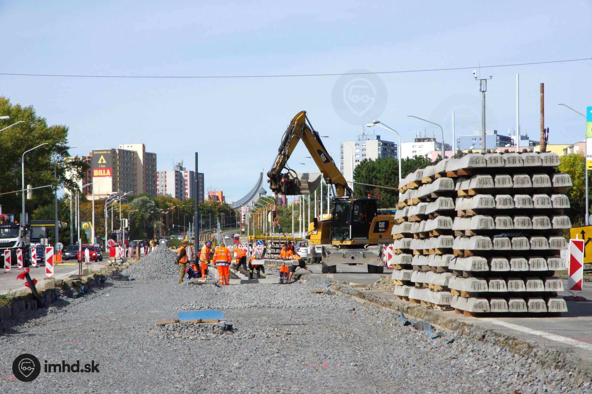 Ukladanie betónových podvalov pre novú trať.