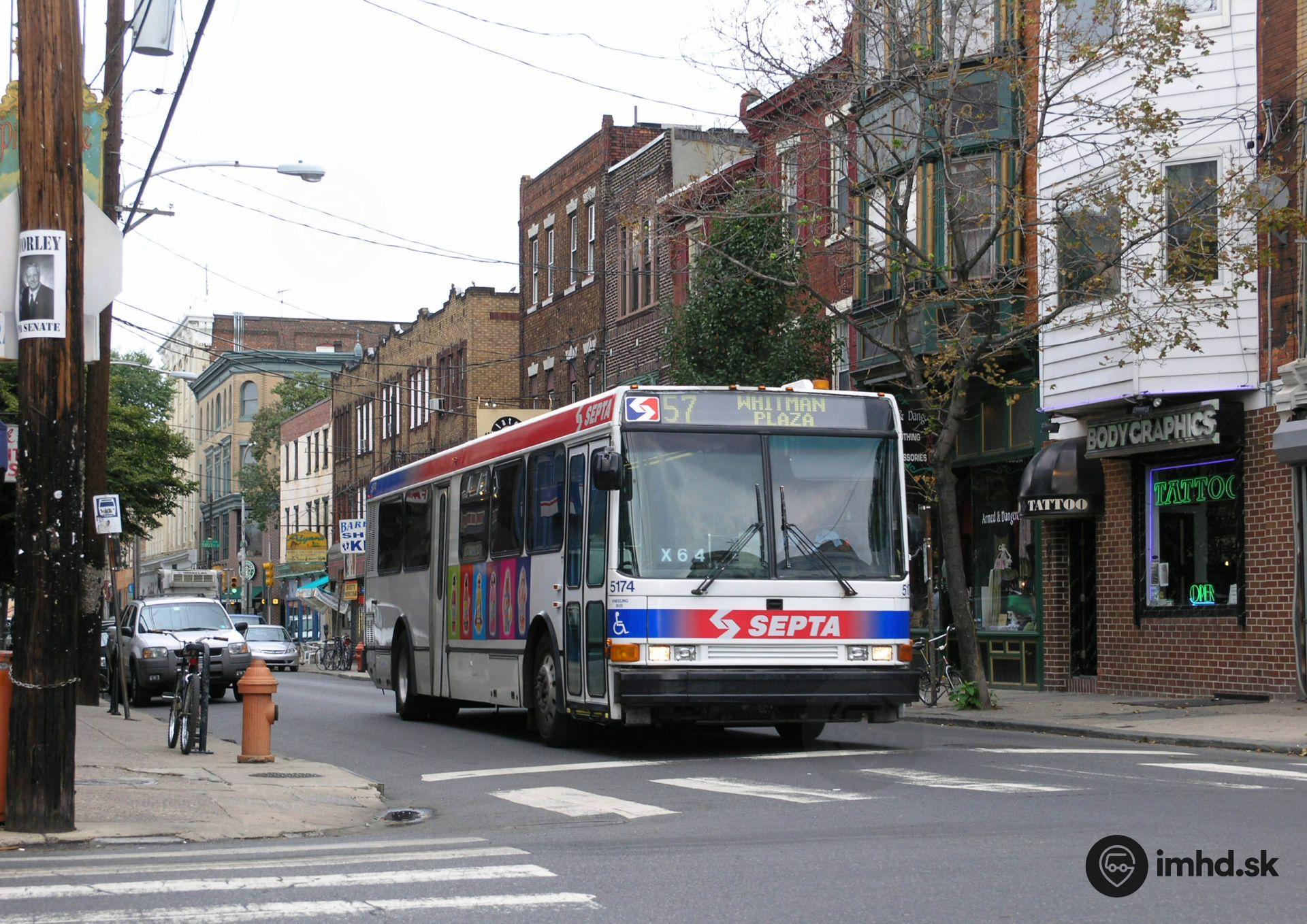 NABI Ikarus 416.08 #5174 križuje bláznivú South Street a po 4th Street smeruje k shopping centru Whitman Plaza v južnej Philadelphii.