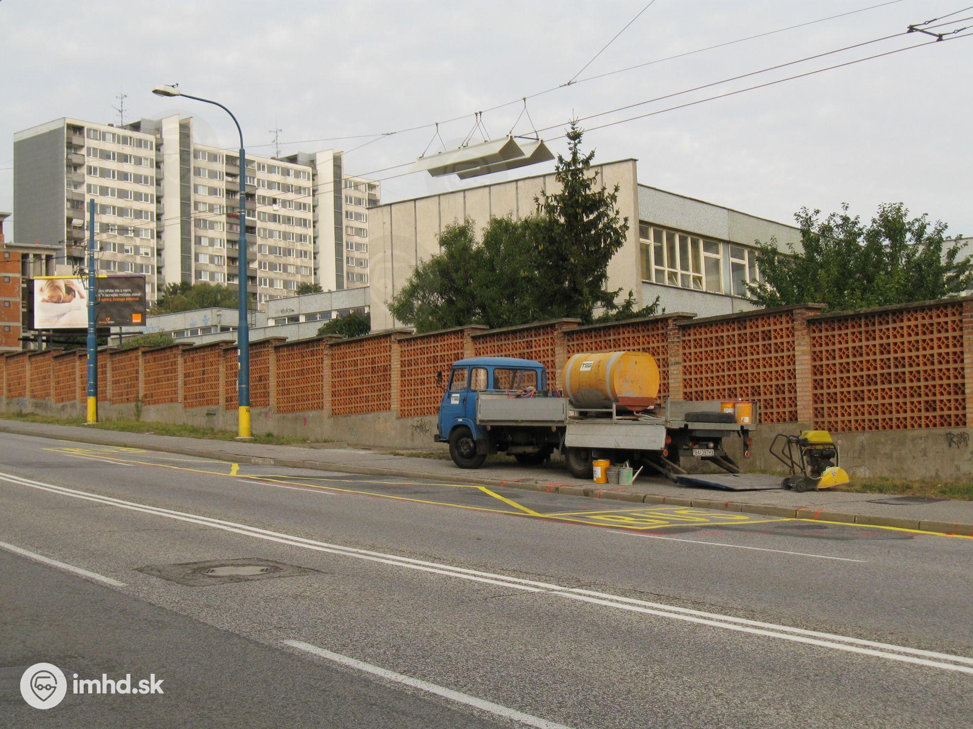 "Cvičná" verzia novej zastávky predtým, než ju krátko po nastriekaní vodorovného dopravného značenia rozkopali a zaliali betónom. Striešky na trolejovom vedení boli taktiež odstránené.