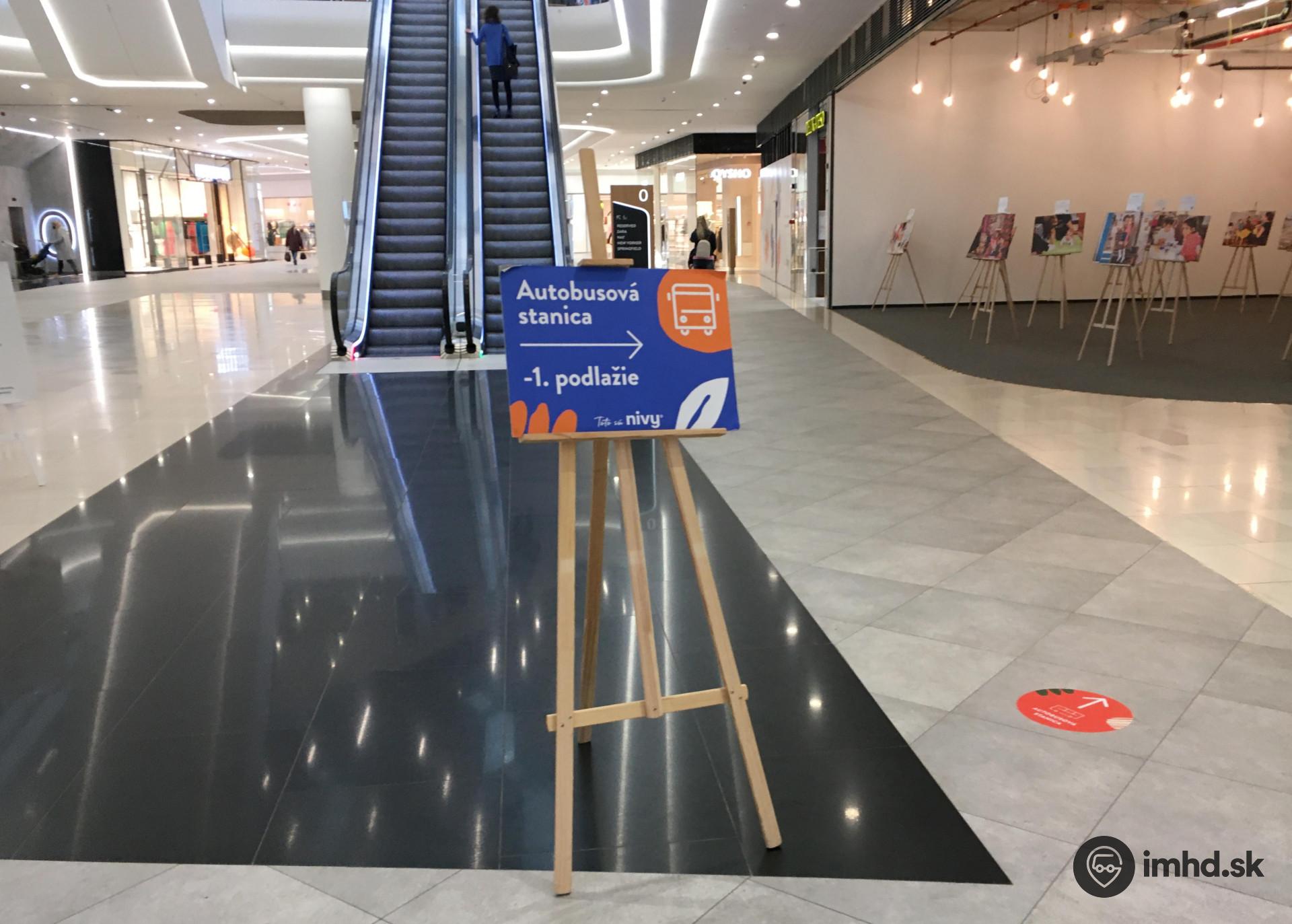Jeden z prvkov navigácie k autobusovej stanici pri vchode od zastávky Autobusová stanica. Najrýchlejšia a bezbariérová cesta k nástupištiam autobusov od tohto vchodu je výťahmi na ľavej strane.
