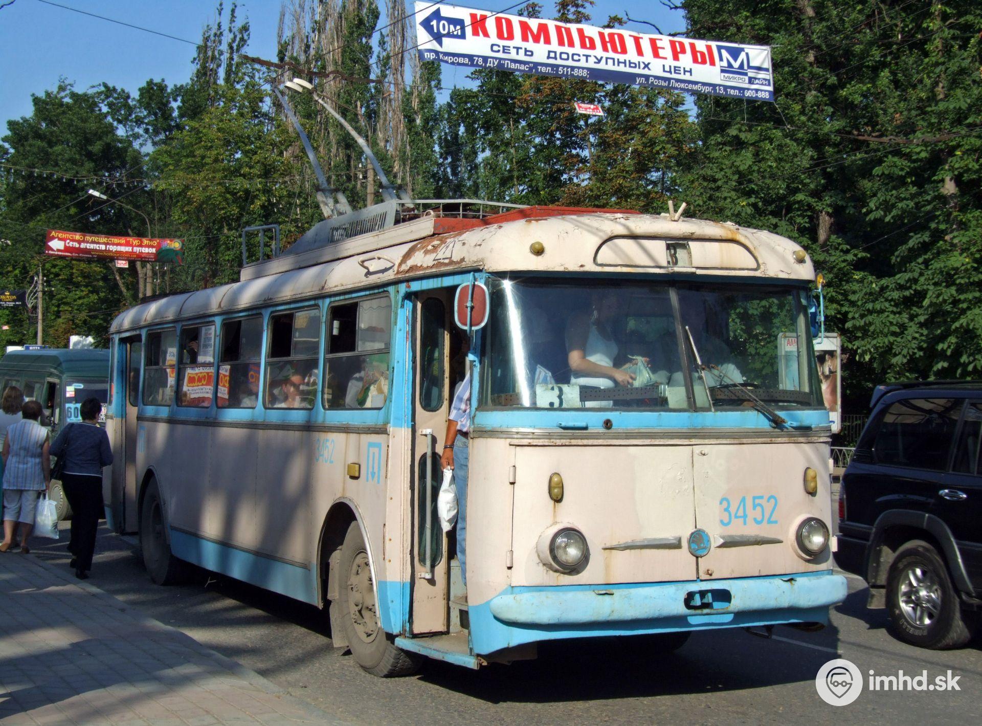 Niektoré trolejbusy sú natreté zvláštnym náterom obsahujúcim aj krikľavo modrú farbu - Škoda 9 Tr #3452 (ex 1452).