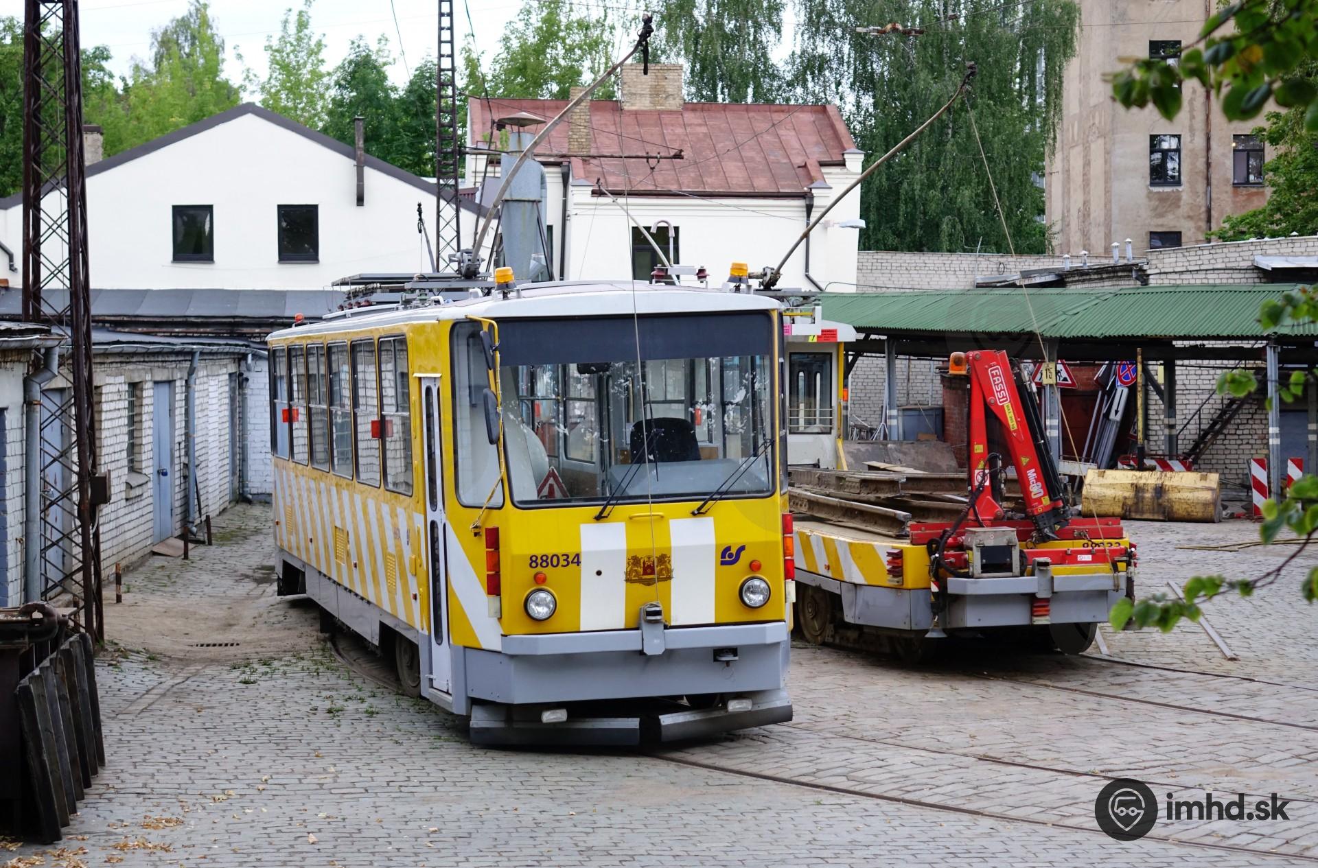 Technologické električky vo vozovni: obojsmerný brúsiaci vozeň T6B5SU #88034 a nákladná električka T6B5SU s mechanickým ramenom #88033.