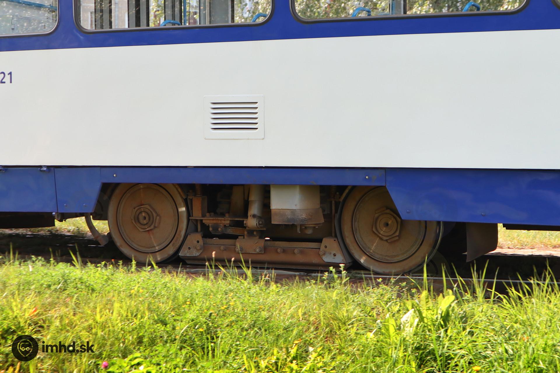Pohľad na predný podvozok električky ČKD Tatra T6B5-R #35121 pri prejazde výhybkou v obratisku Eglaines iela / Dole