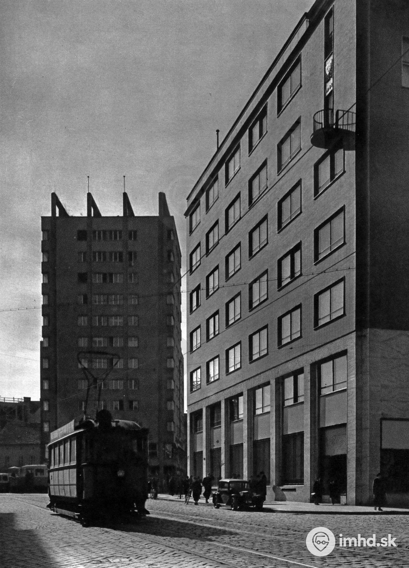 Vyústenie Špitálskej ul. na Kamenné námestie s päťokennou električkou Ganz.