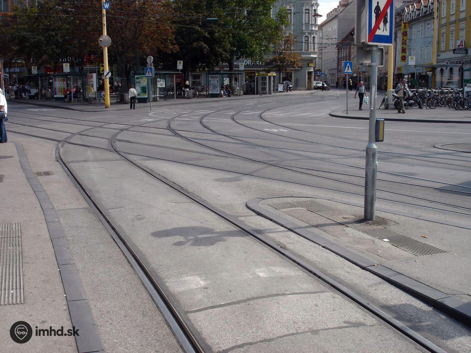 Jakominiplatz, cez ktoré prechádzajú všetky električkové linky.