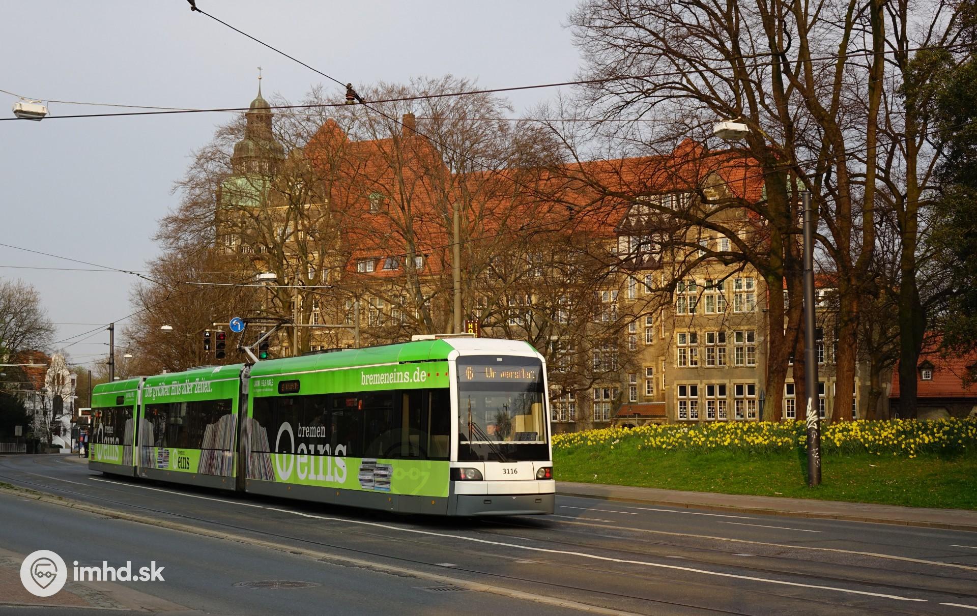 Bombardier / Vossloh Kiepe Flexity Classic GT8N-1 pri narcisovom záhone.