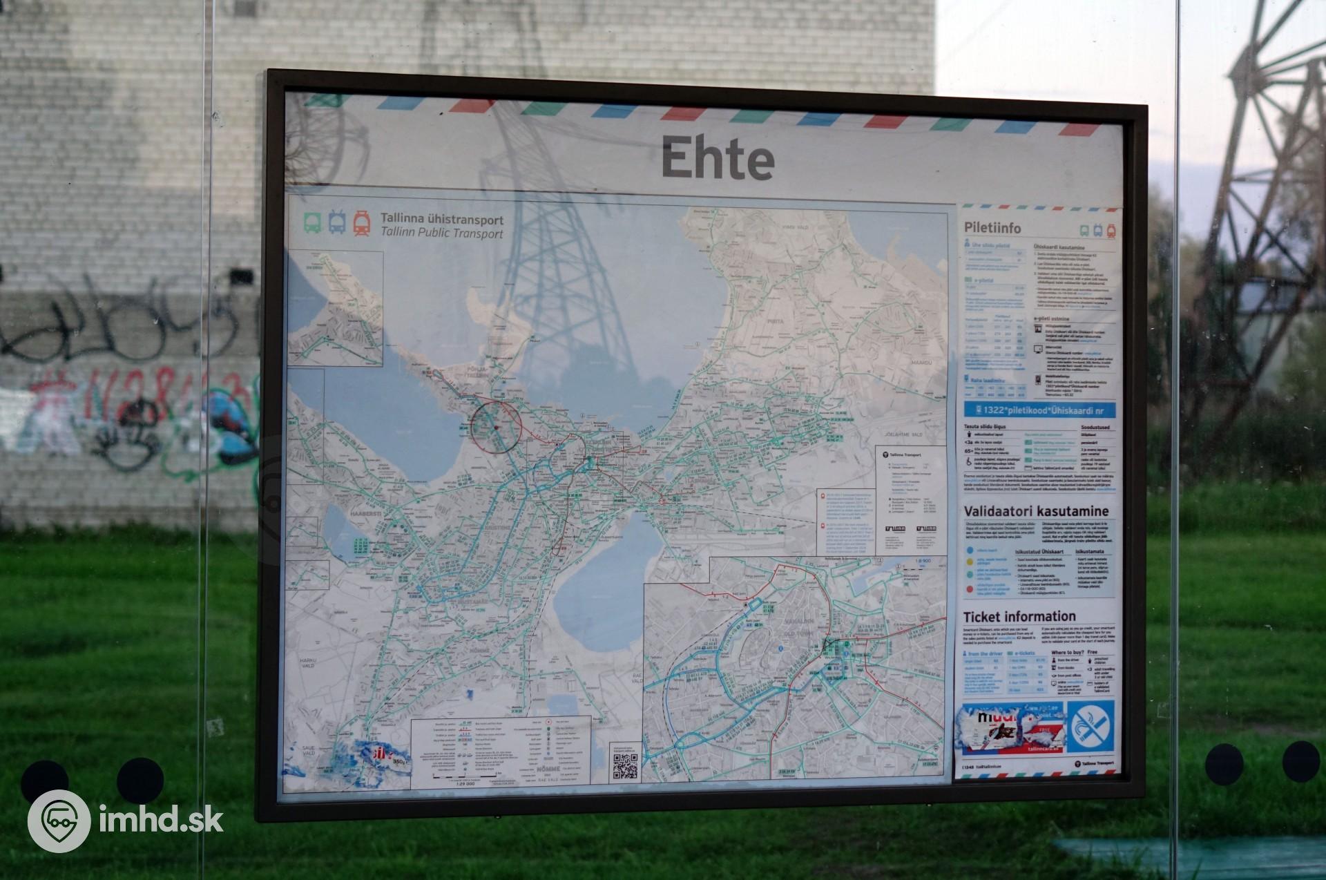 Prehľadné informácie pre cestujúcich vo vitríne na zastávkach (rovnaké vitríny sa používajú aj v Bratislave a Košiciach). Informácie v estónčine sú doplnené niektorými informáciami v anglickom jazyku. Vo vitríne sa však nenachádzajú cestovné poriadky, ktoré je potrebné hľadať mimo prístrešku pod označníkom. Za povšimnutie stojí jednotný vizuál naprieč celou MHD, ktorý sa postupne zavádza. Okrem jednotného druhu písma sa používajú jednotné zošikmené pruhy na informačných materiáloch (na fotografii v hornej časti) aj na vozidlách. Električky, trolejbusy a autobusy sú rozlíšené rovnakými farbami na vozidlách aj v schéme (červenou, modrou a tyrkysovou). | |
