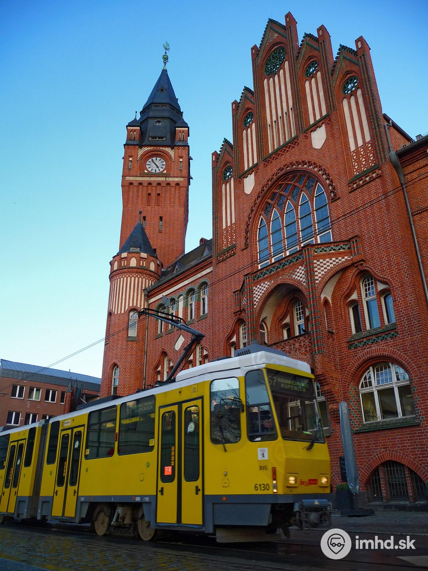 Žltá súprava KT4 pred červenou tehlovou budovou radnice mestskej časti Köpenick.