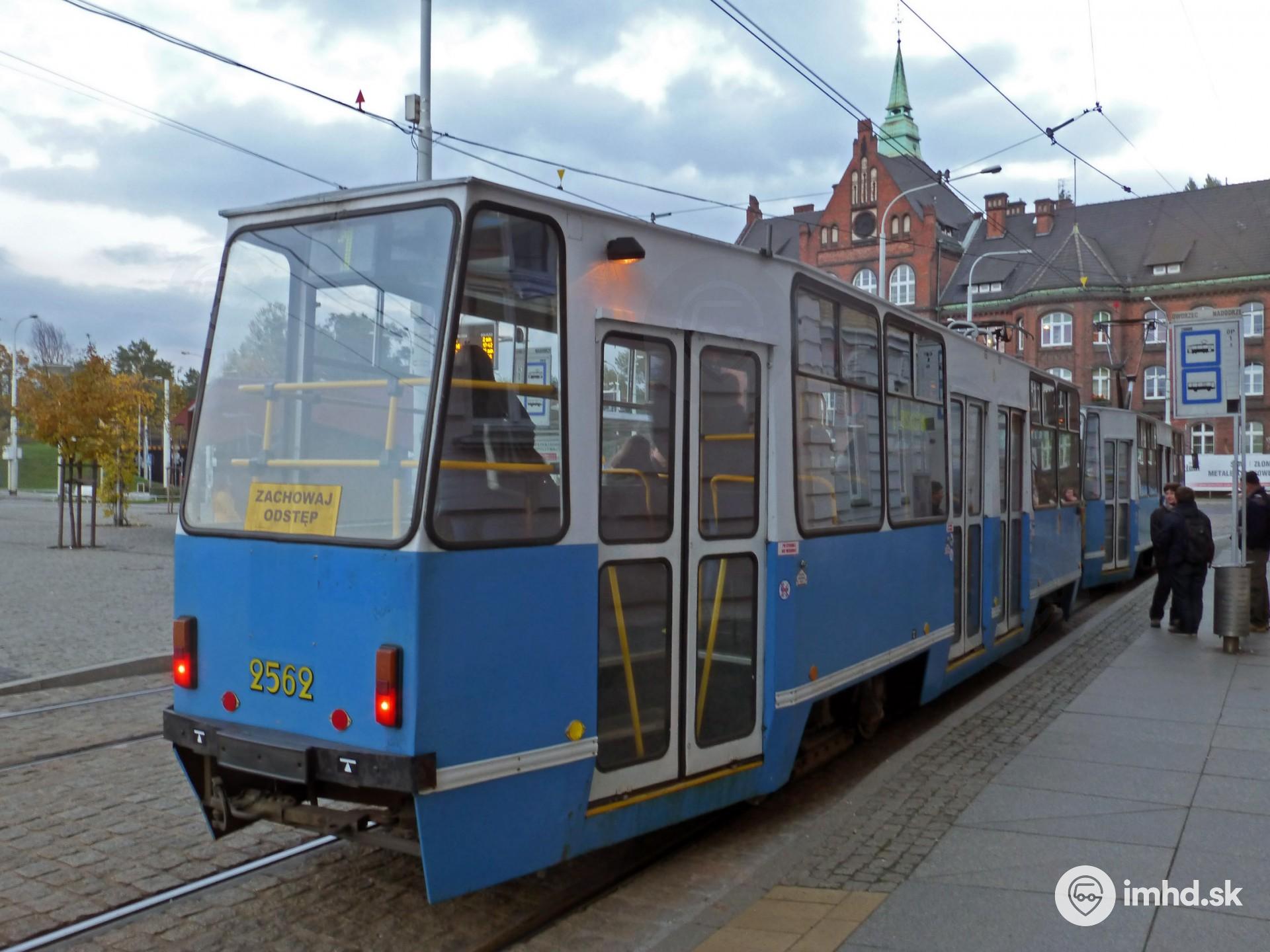 Súprava električiek Konstal 105Na #2561+2562 na zastávke pred stanicou Dworzec Nadodrze.
