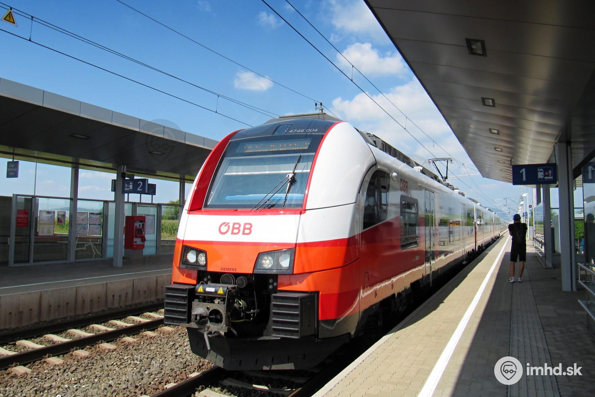 Súprava Siemens Desiro Mainline prichádza do zastávky pri letisku v Grazi
