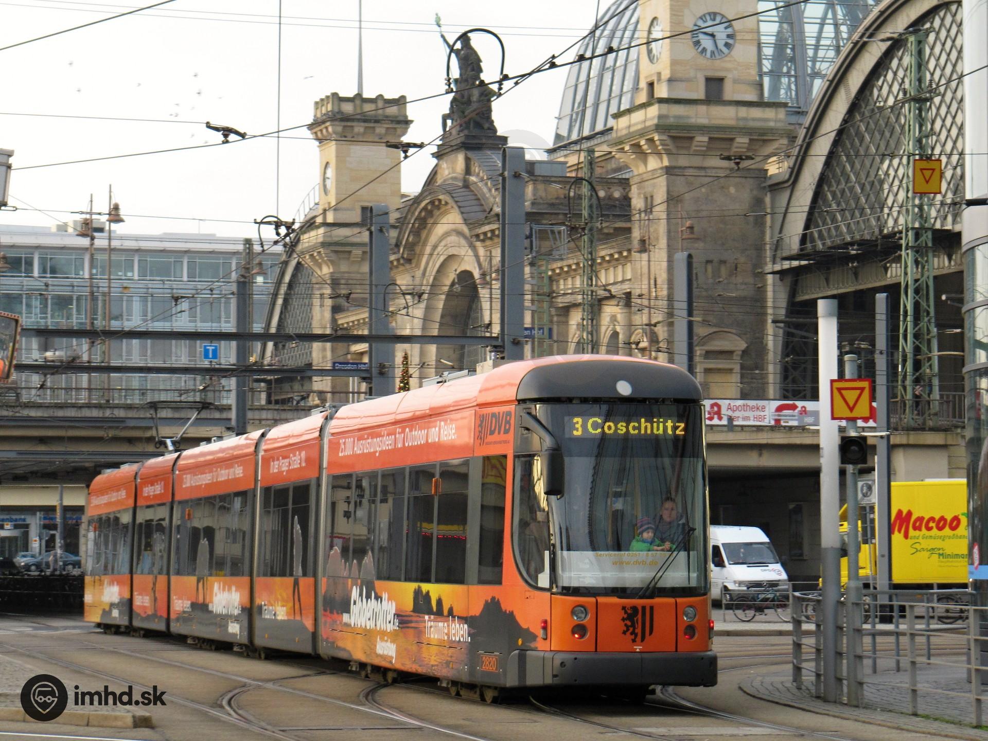 Flexity 12 #2820 smeruje k zastávke priamo pred hlavnou železničnou stanicou.