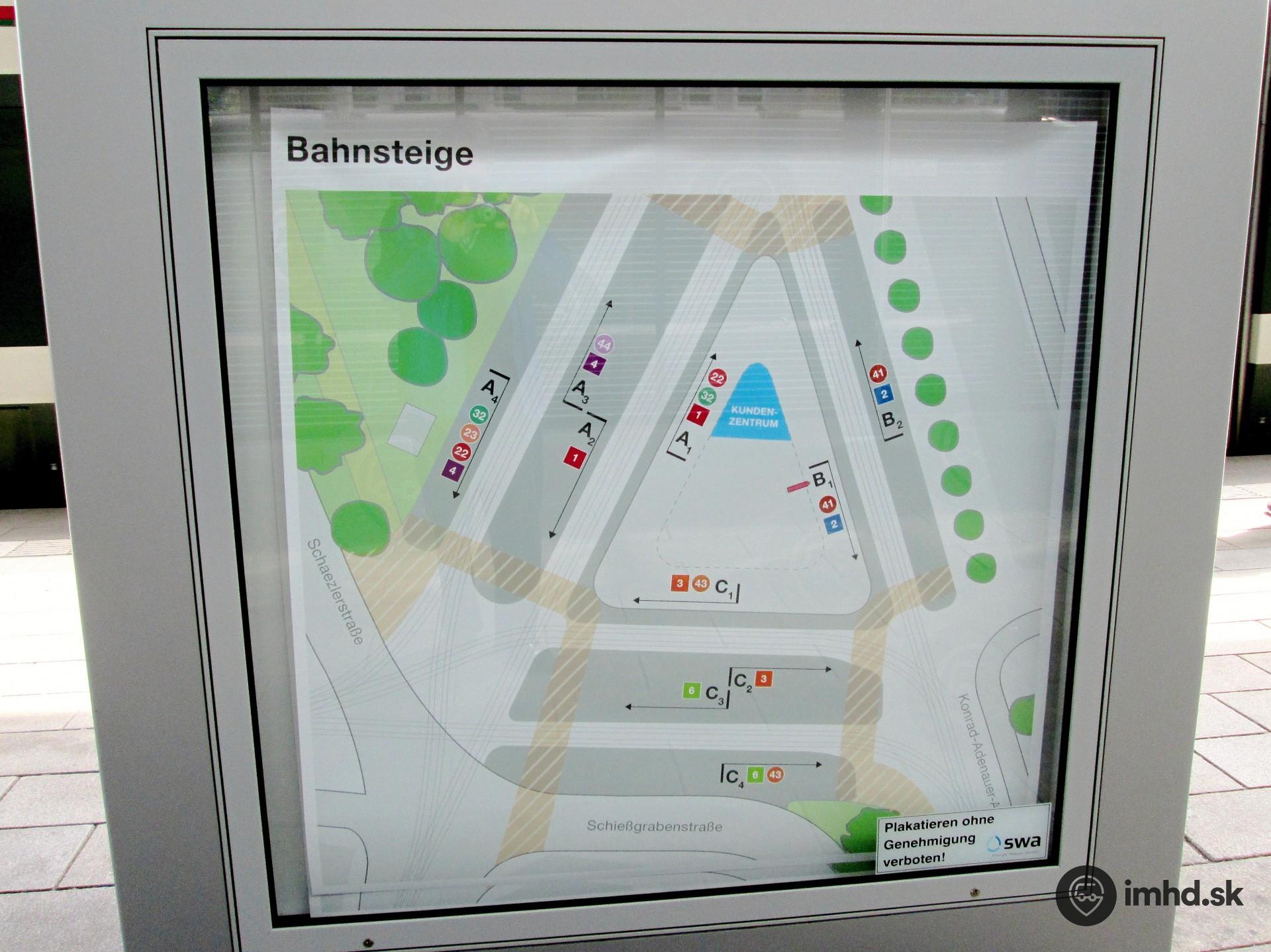 Terminál Königsplatz je zaujímavý svojím trojuholníkovým pôdorysom, ako je zrejmé aj zo schémy stanovíšť terminálu.