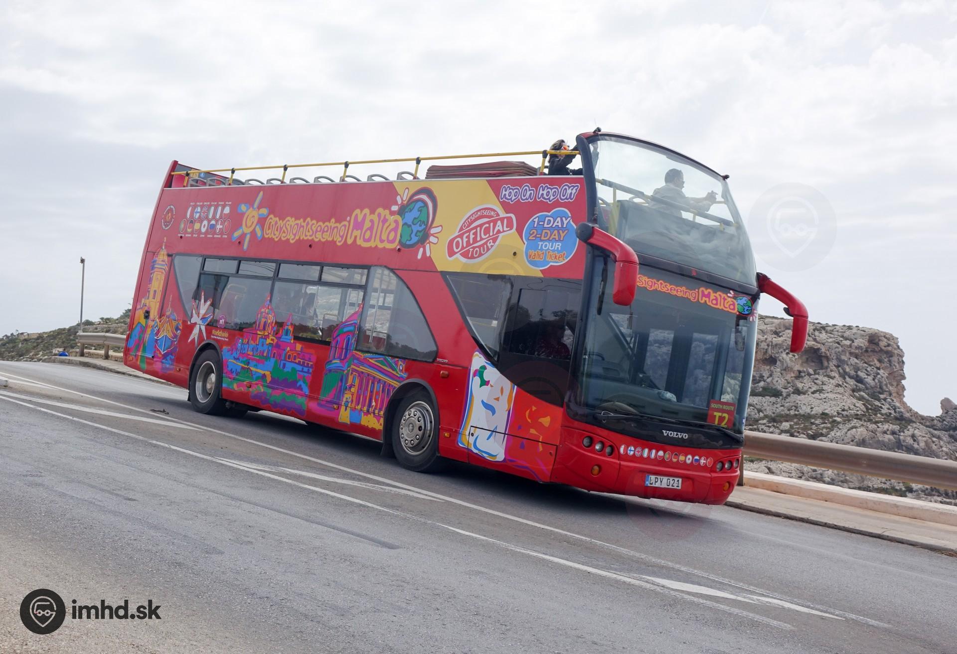 Volvo B7L / Ayats Bravo City na strmej ceste na útese nad Blue Grotto.