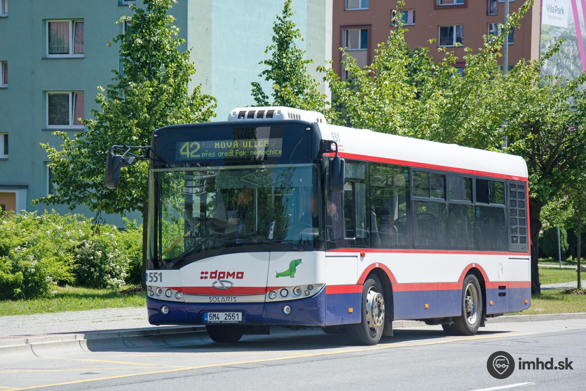Solaris Alpino 8,6 #551 na Novej Ulice, kde má prestávku. Tento typ vozidiel v Olomouci je vypravovaný na linku 42, ktorá spája konečnú električiek s rozsiahlym areálom FN v Olomouci.