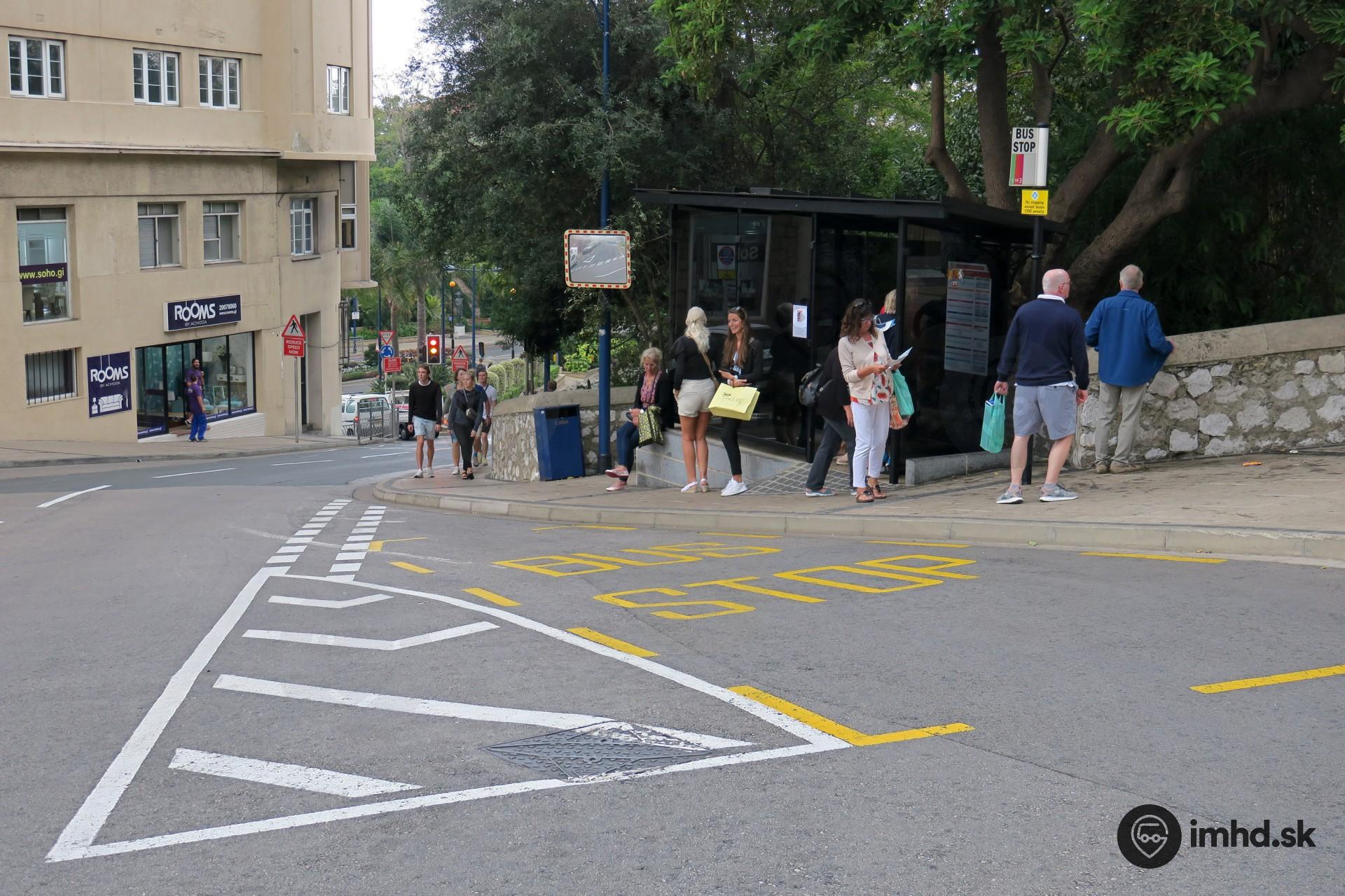 Zastávka autobusu v križovatke Trafalgar Road a Europa Road.