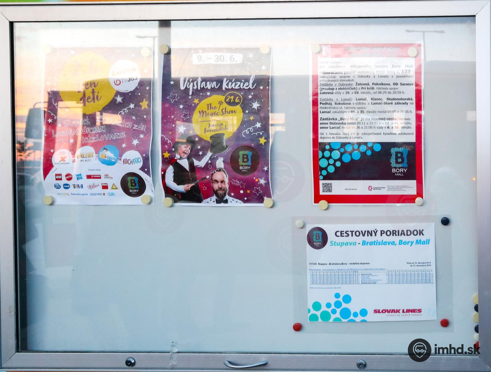 Informácie pre cestujúcich na zastávke Bory Mall.