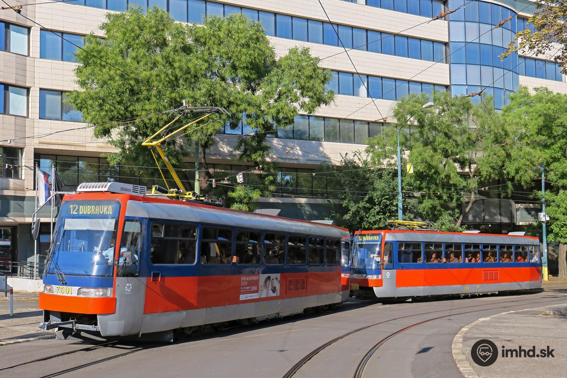Súprava T3S #7301+7302 na výlukovej linke 12, ktorá premávala v dňoch 15. - 17. 8. 2018 z Dúbravky do Ružinova namiesto liniek 6 a 9.