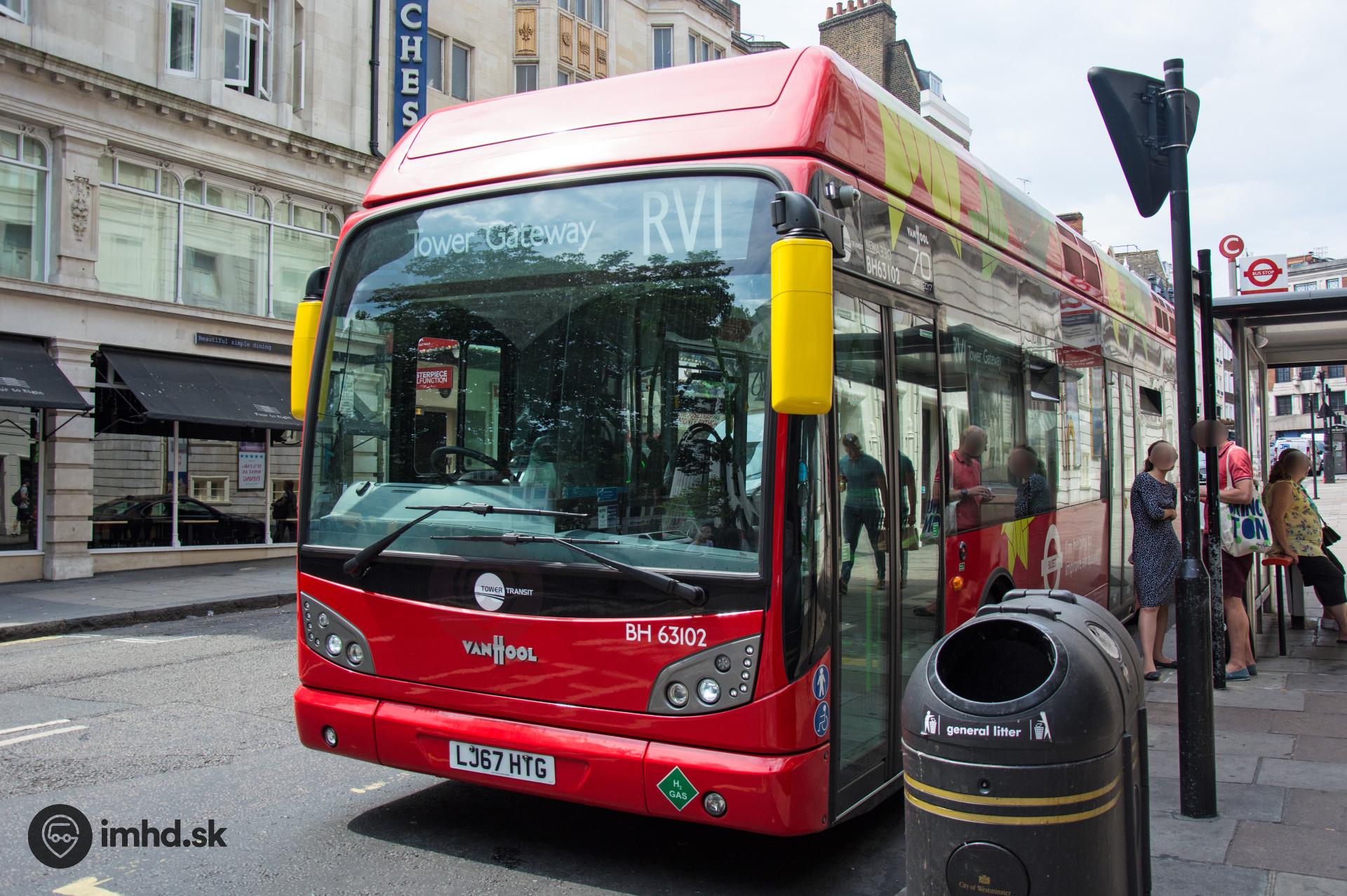 Jeden z dvojice autobusov Van Hool A330FC s vodíkovým pohonom, ktorý možno stretnúť v Londýne. Jazdia spolu s dalšími vodíkovými autobusmi Wright Pulsar na linke RV1.