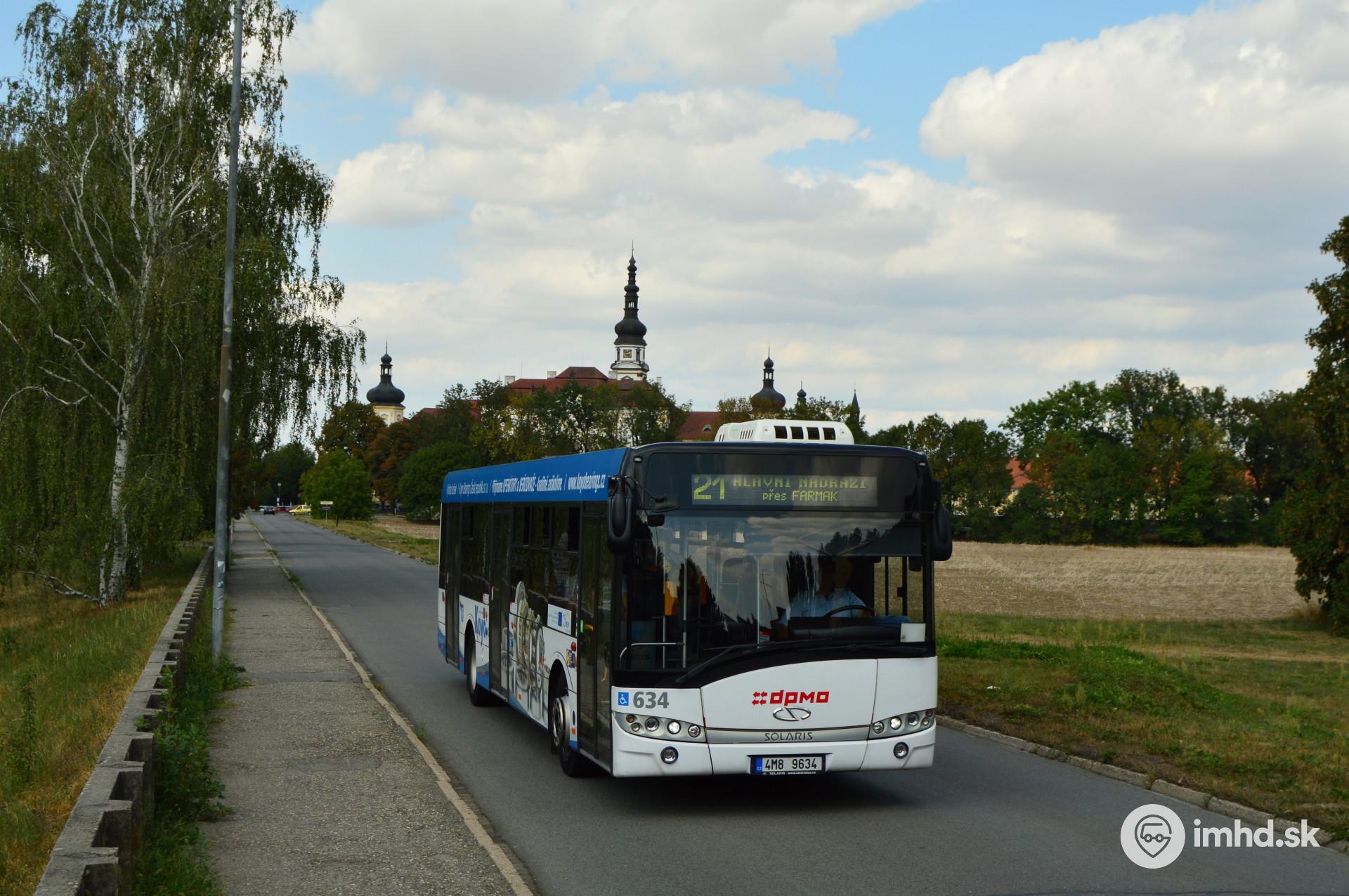 #634 s reklamou na ložiská Koyo smeruje na Hlavní nádraží. V pozadí sa rozprestiera Klášterní Hradisko, ktoré v súčasnosti slúži ako vojenská nemocnica.