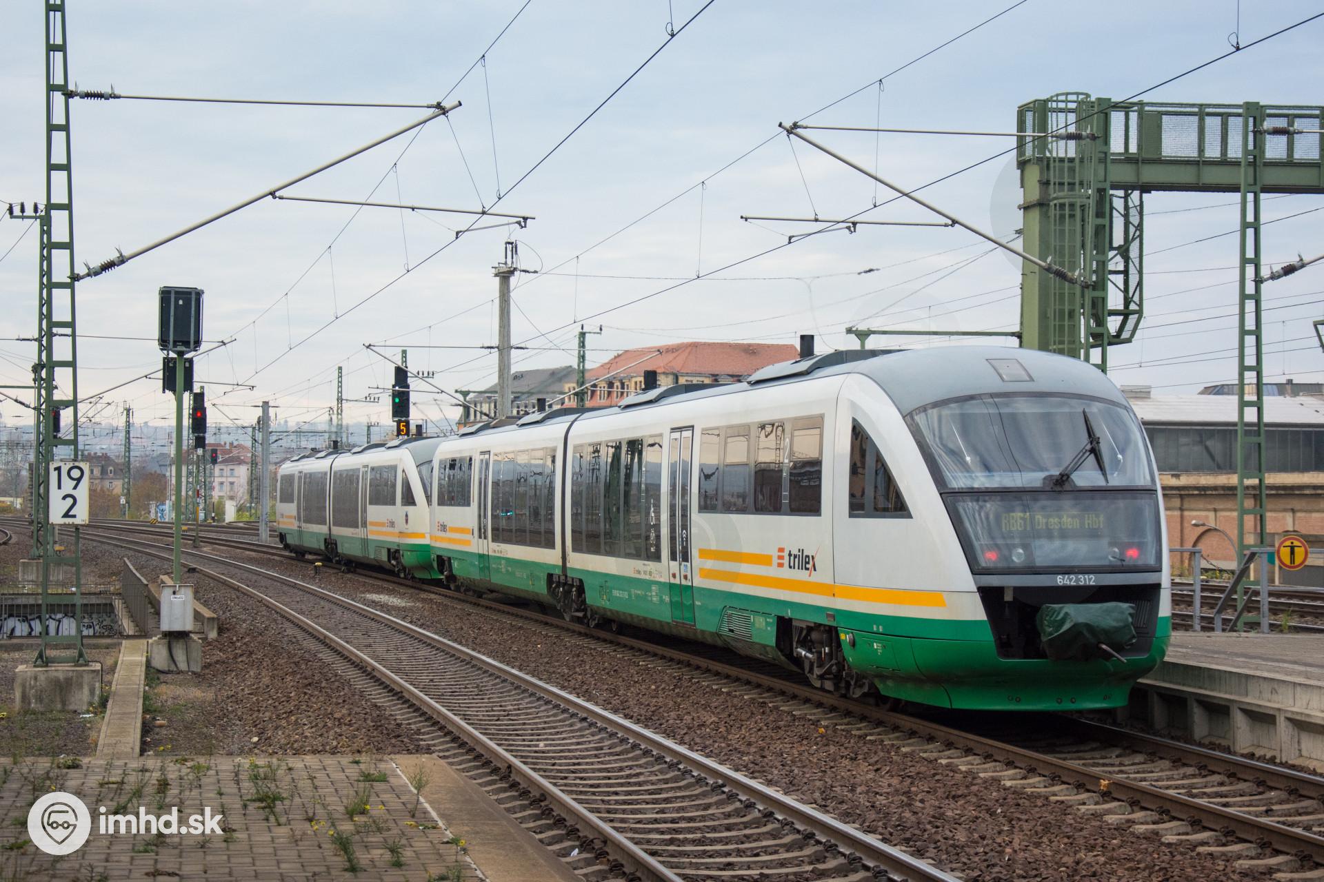 Dvojica motorových jednotiek Siemens Desiro odchádza zo železničnej stanice Dresden-Mitte
