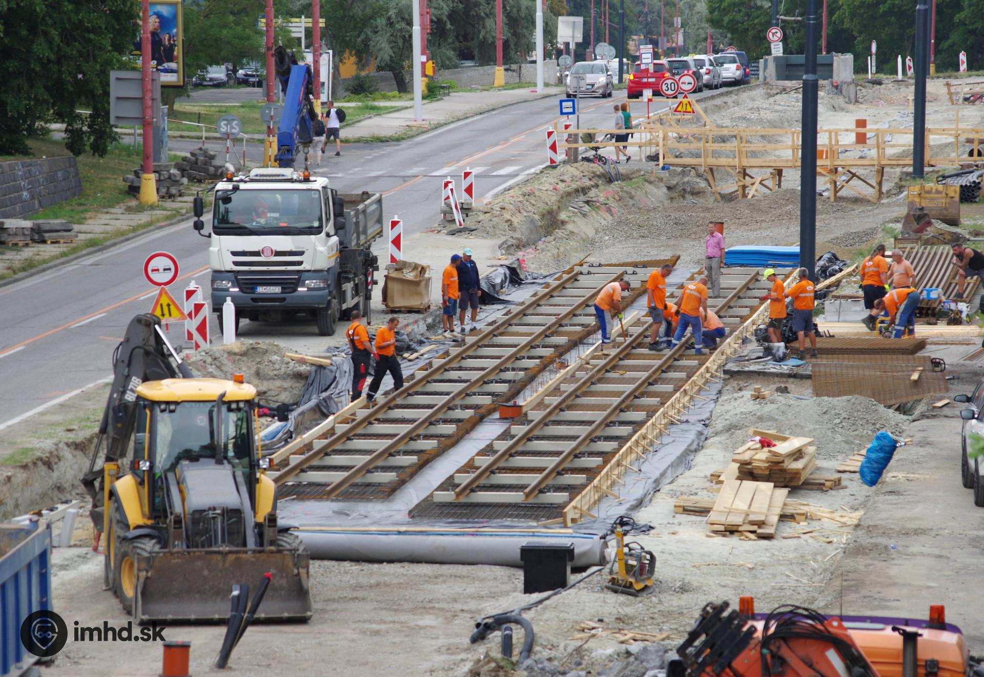 Budovanie koľajového zvršku pri priecestí medzi zastávkami Borská a Karlova Ves.