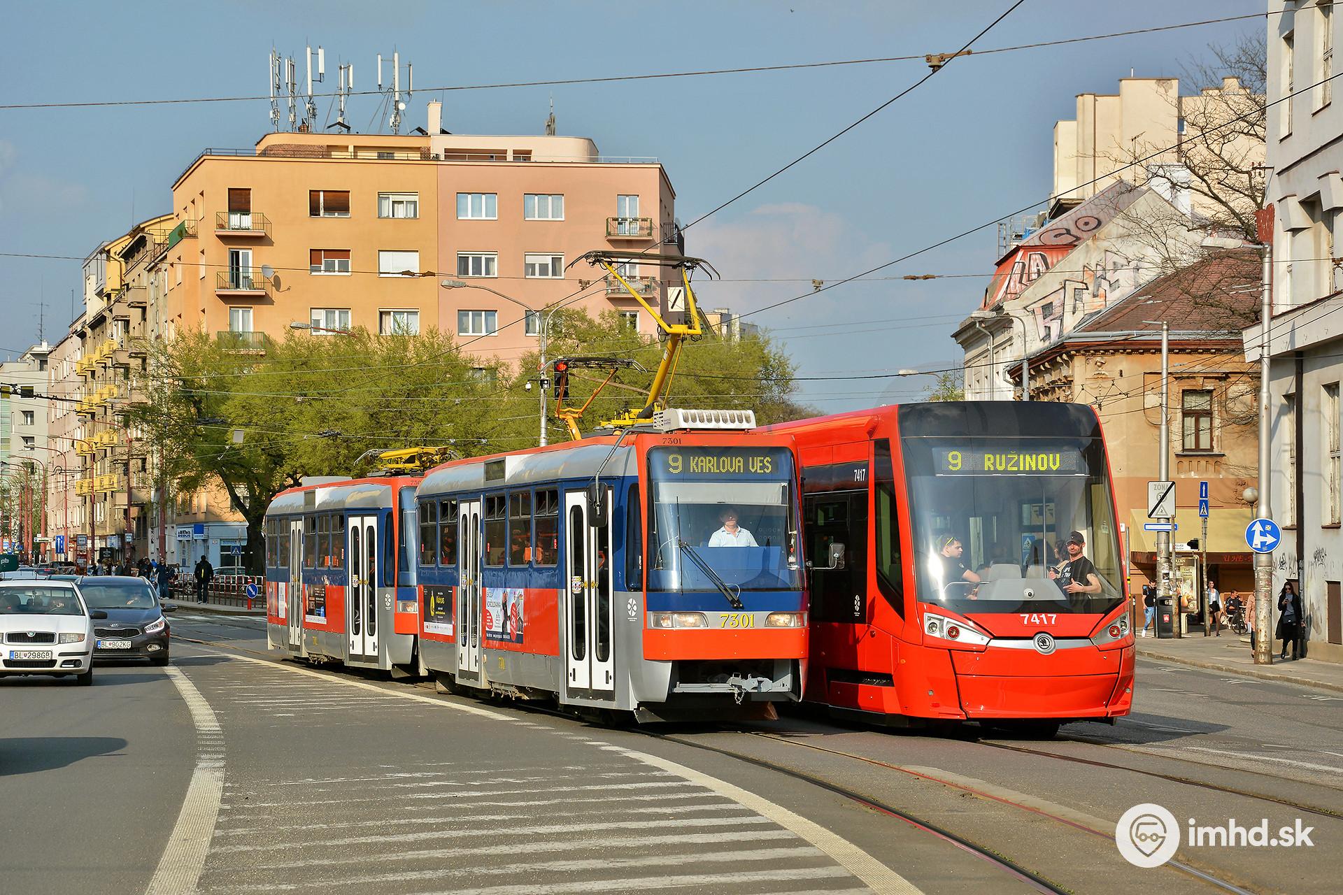 Stretnutie dvoch deviatok - jedna súprava električiek je modernizovaná, druhá električka nová.