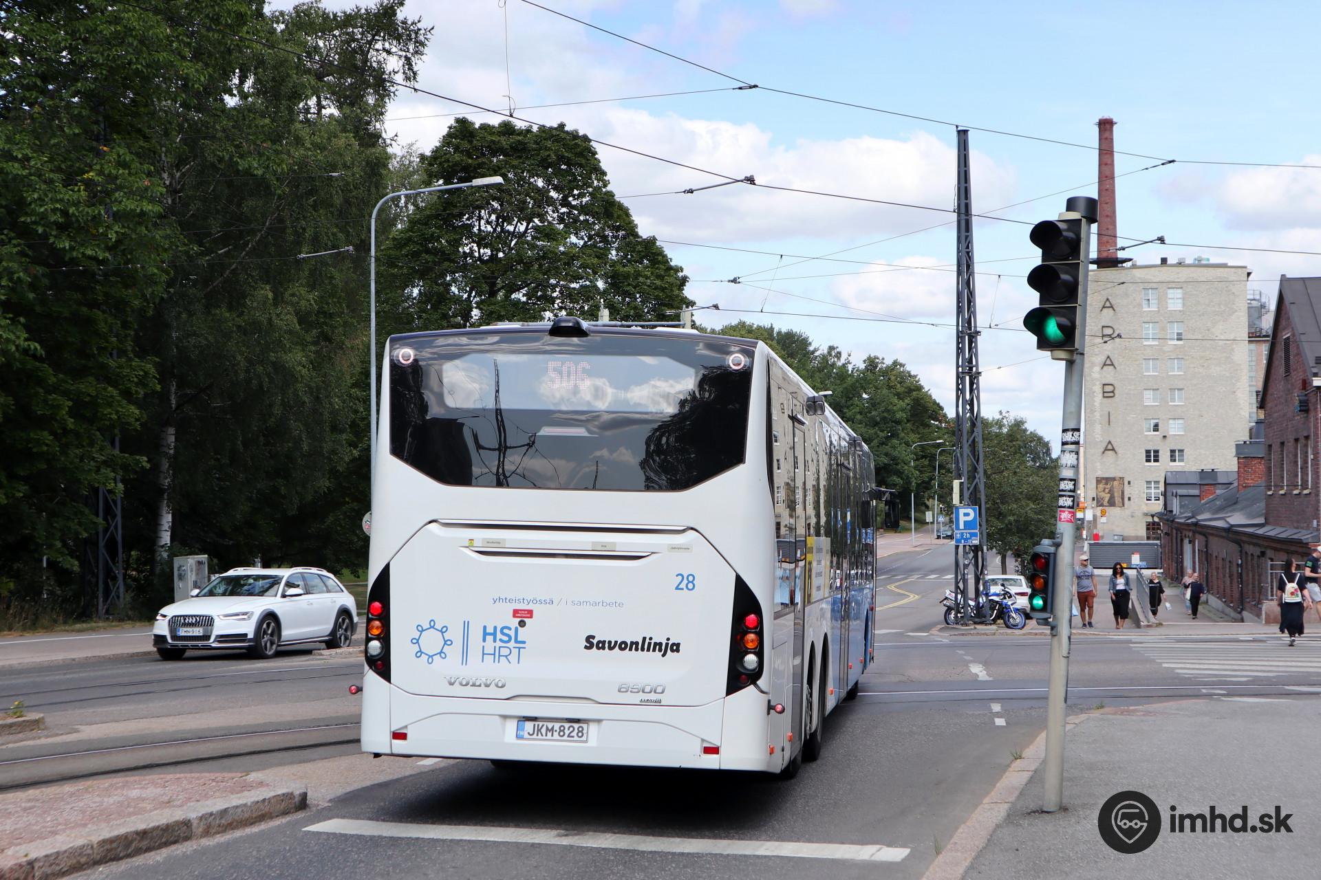 Volvo 8900LE 6x2 #28 dopravcu Savonlinja na linke 506 križuje električkovú trať na sídlisko Arabianranta. V pozadí sa nachádza budova fabriky na výrobu porcelánu Arabia, ktorá neskôr bola sídlom Fakulty umení, dizajnu a architektúry a dnes funguje ako knižnica a múzeum.