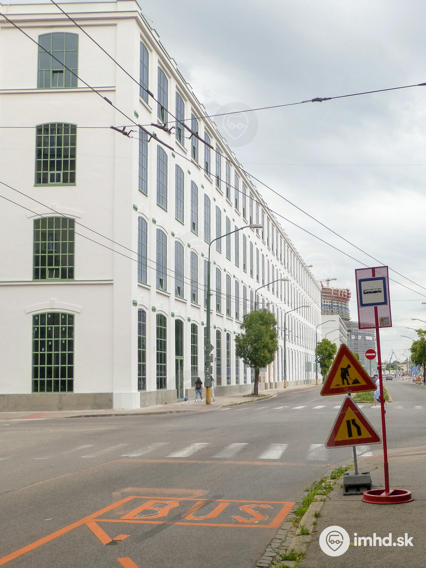 Označník dočasnej zastávky s budovou Cvernovky.