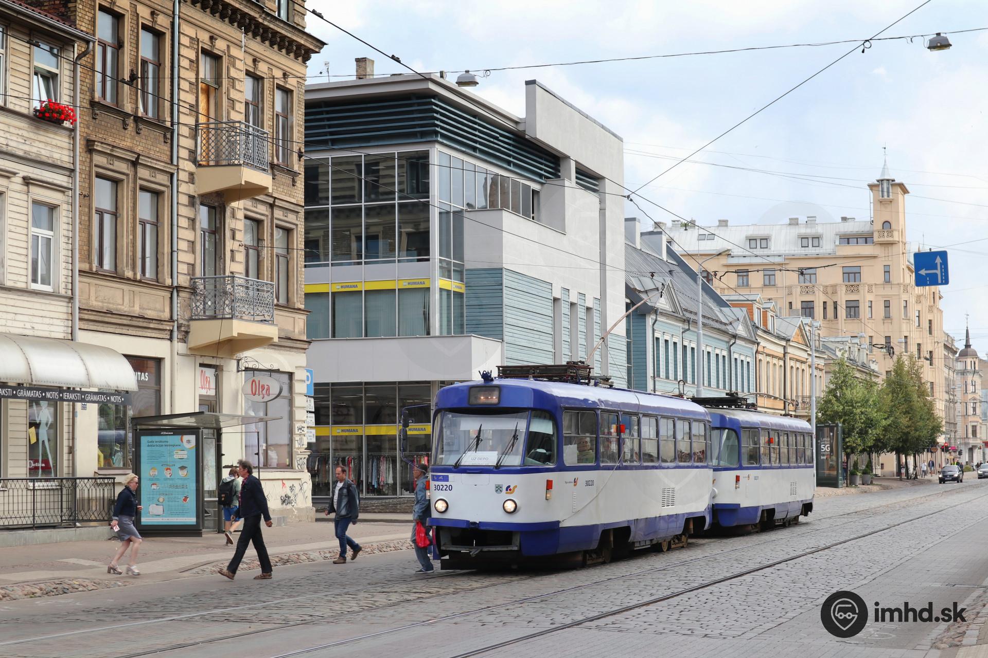 Súprava električiek ČKD Tatra T3A na čele s #30220 stojí na zastávke Ģertrūdes iela na dojazdovom spoji do vozovne.