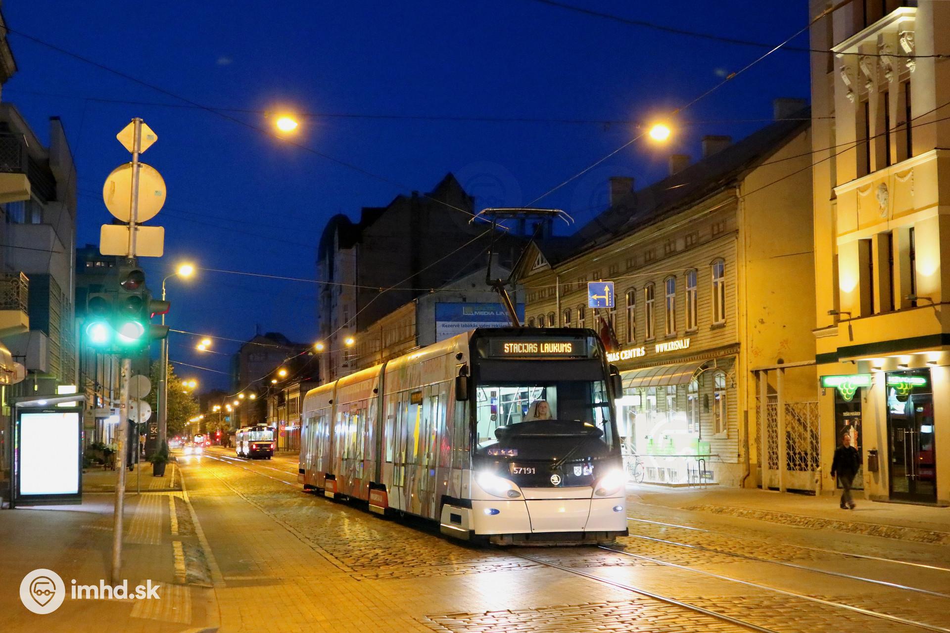 Škoda ForCity Alfa #57191 odchádza zo zastávky Ģertrūdes iela ako dojazdový spoj do centra odkiaľ bude pokračovať do vozovne