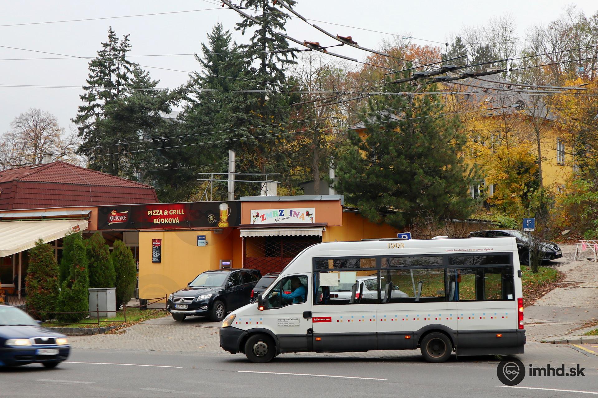 Takmer desaťročný minibus Rošero-P City #1909 vyráža z obratiska Búdková na linku 147