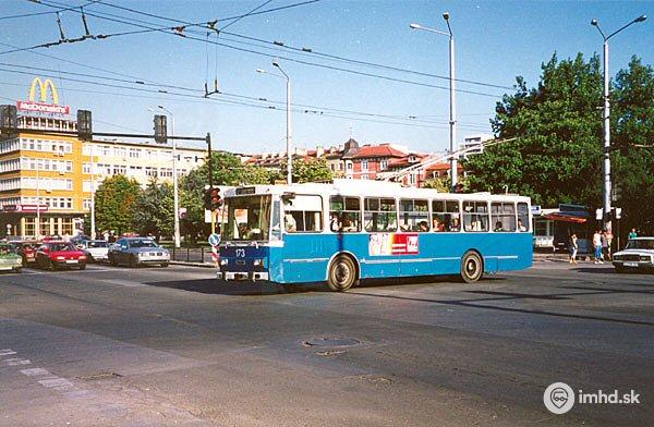 Modrý trolejbus 14Tr e. č. 173 na križovatke ulíc Bačo Kiro a Christo Botev