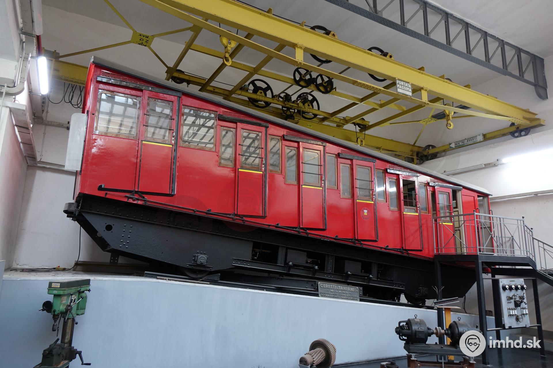 Historický vozeň lanovky Funicolare Centrale, ktorá bola pôvodne navrhnutá tak, aby mohla premávať aj hodinu po výpadku prúdu, a to vďaka batériám.