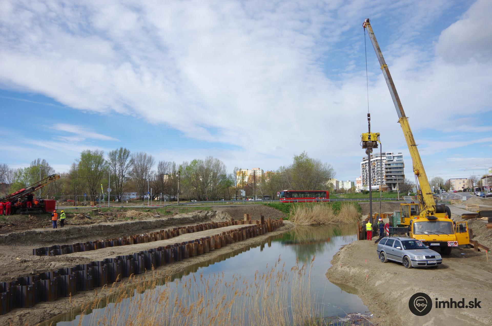 Príprava základov mosta, ktorý bude tvoriť cestno-električkovú križovatku Jantárovej cesty a Rusovskej cesty