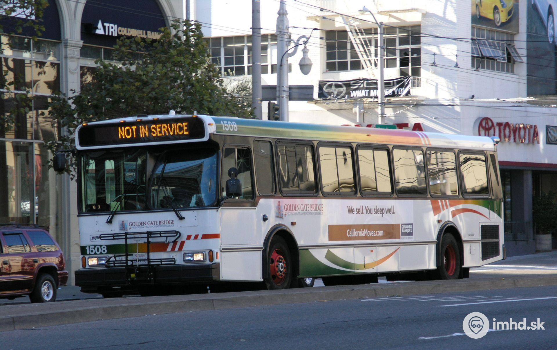 Autobus Orion V #1508 na manipulačnej jazde na Van Ness Avenue. Vozidlo slúži spoločnosti Golden Gate Transit, ktorá zabezpečuje prímestskú dopravu. Autobusy tohto typu zakúpila v počte 80 ks v roku 2003 a v premávke sú od roku 2004.