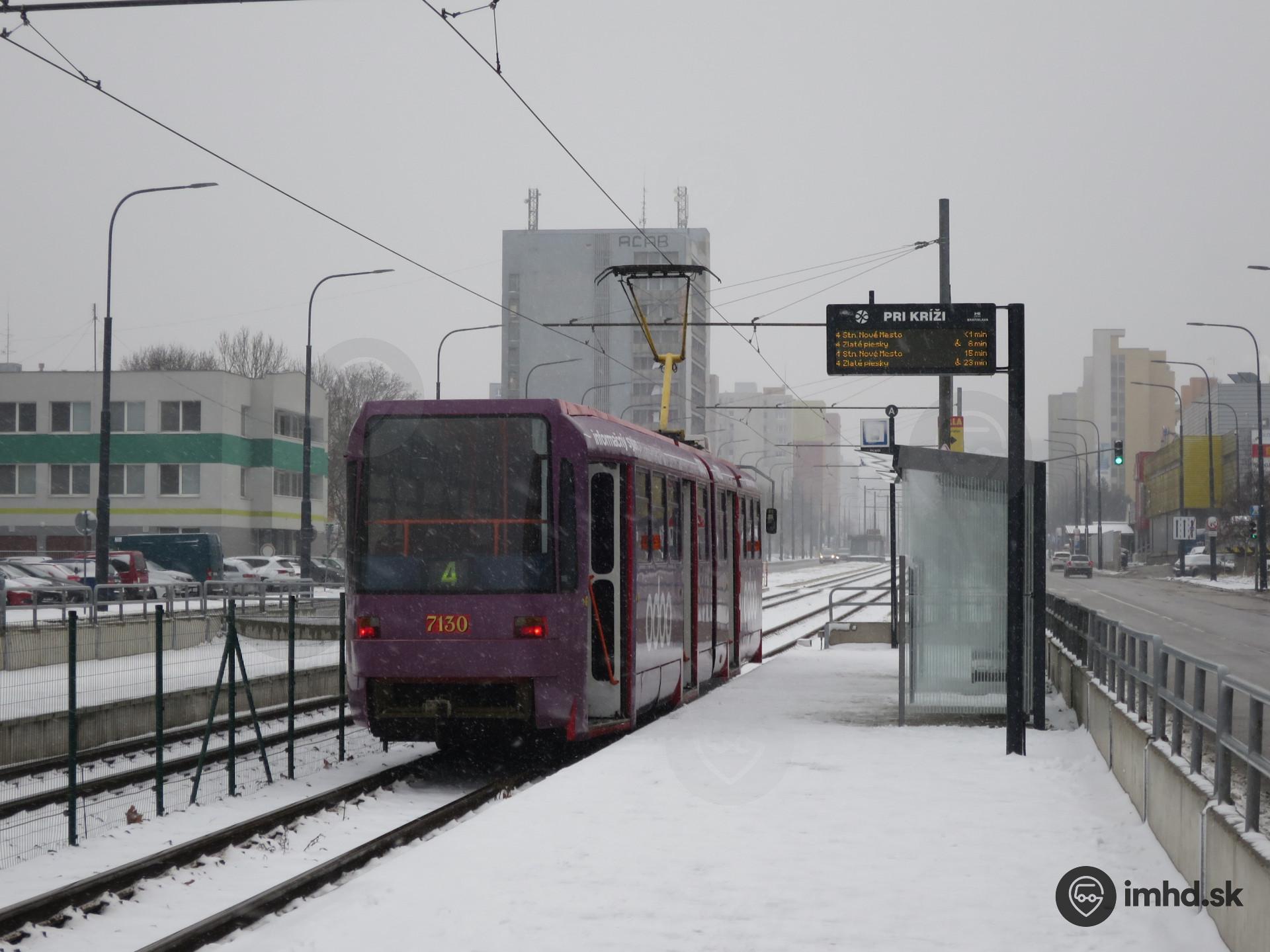 Električka čaká na odchod na zasneženej zastávke Pri kríži.