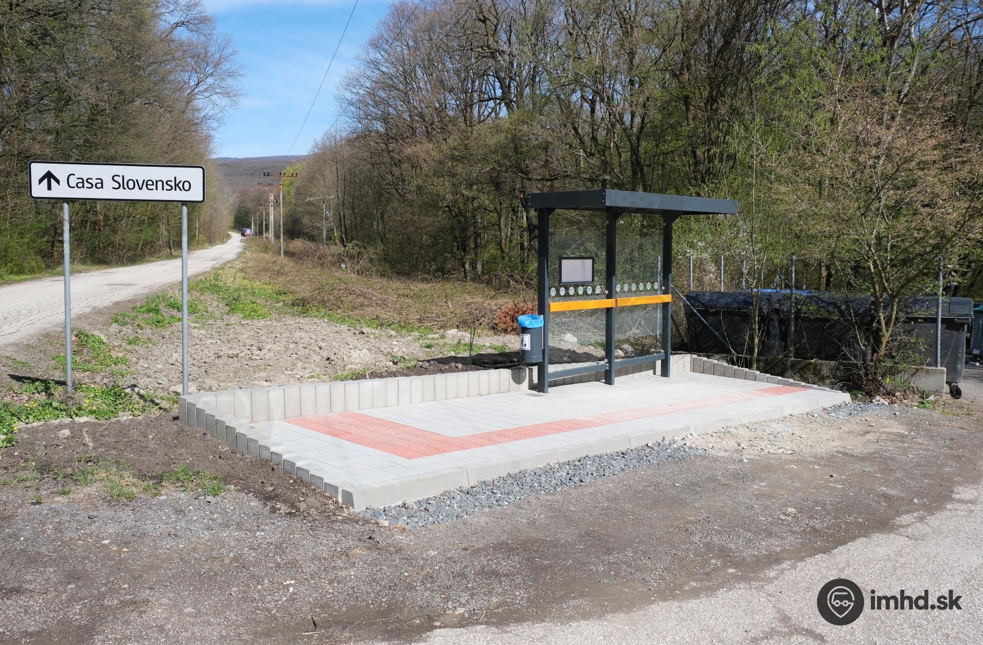 Novovybudované nástupište na konečnej zastávke Kučišdorfská dolina elegantne vsadené do okolitého terénu. Informačná vitrínka v prístrešku zíva prázdnotou.