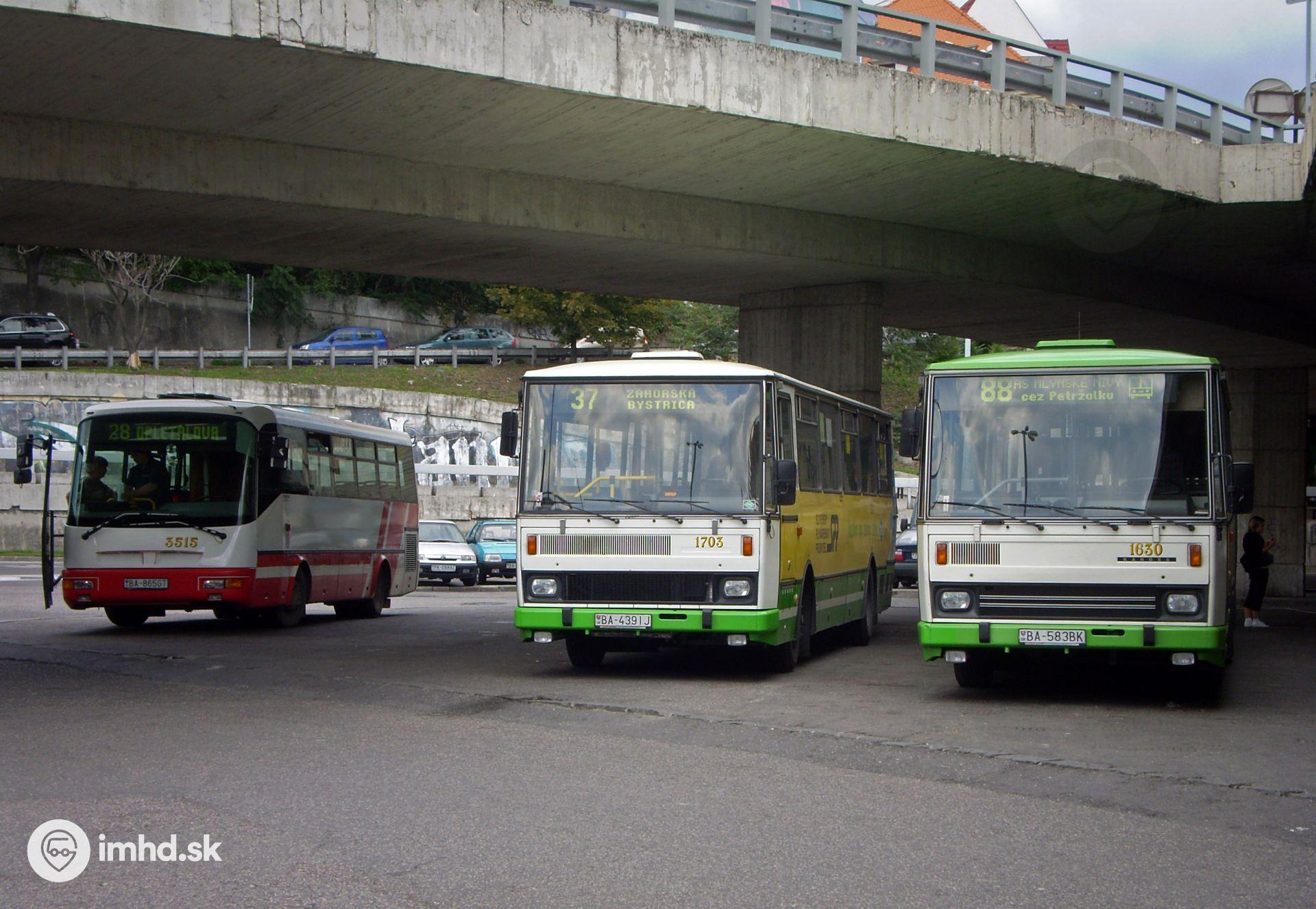 Trojica autobusov pod novým mostom (sprava): Karosa B 741 CNG #1630, Karosa B 732 CNG #1703 a SOR B 9.5 #3515.