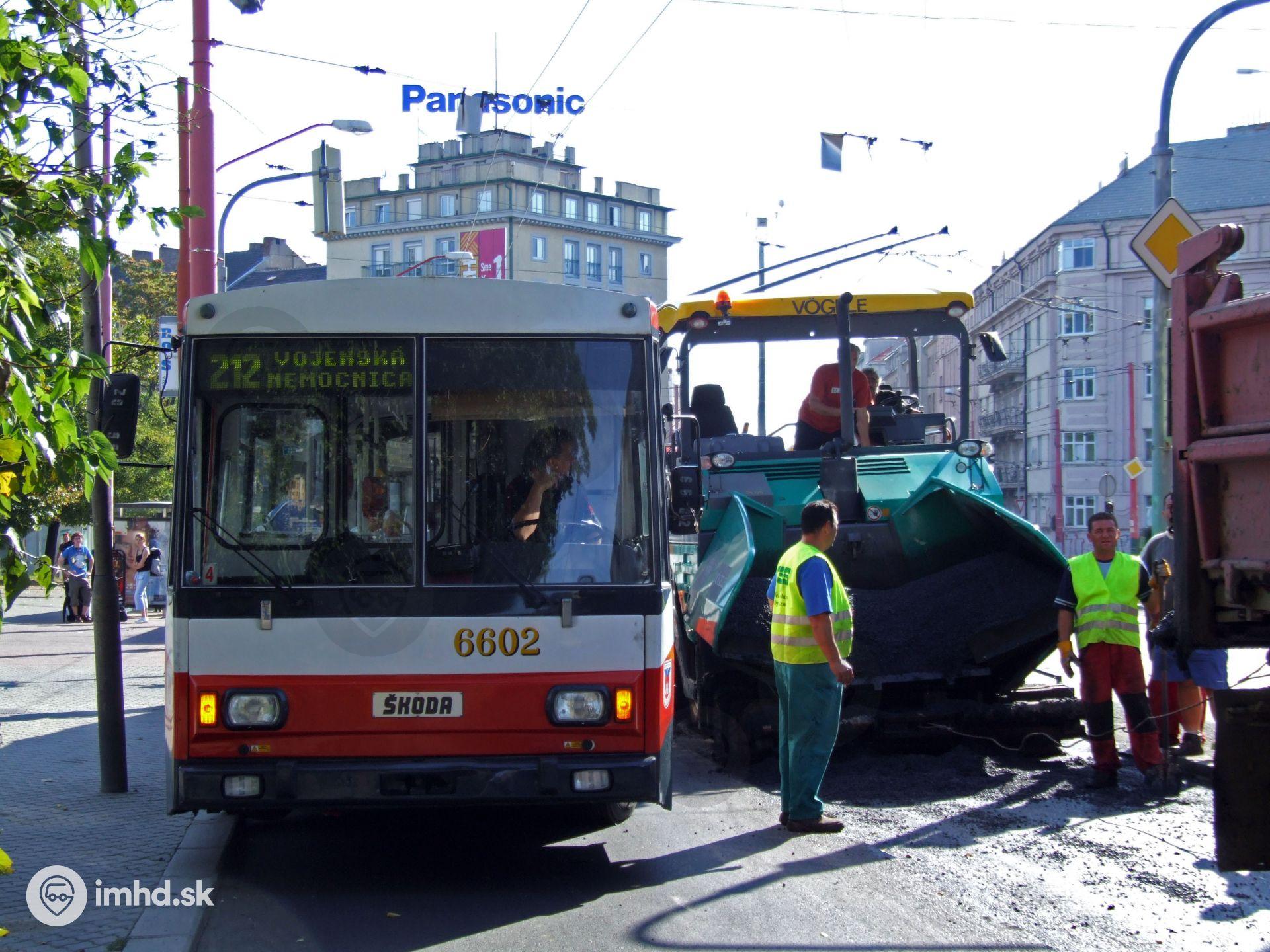 Pokazený asfaltovací stroj neumožnil prejazd trolejbusu na odklonenej linke 212, čím zabolokoval celé Račianske mýto.