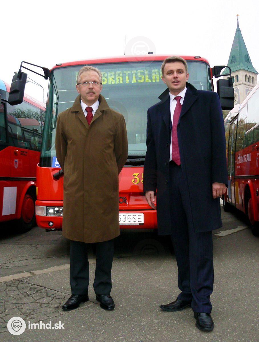 Primátor Bratislavy Andrej Ďurkovský a predseda predstavenstva DPB Branislav Zahradník pred novým autobusom SOR.