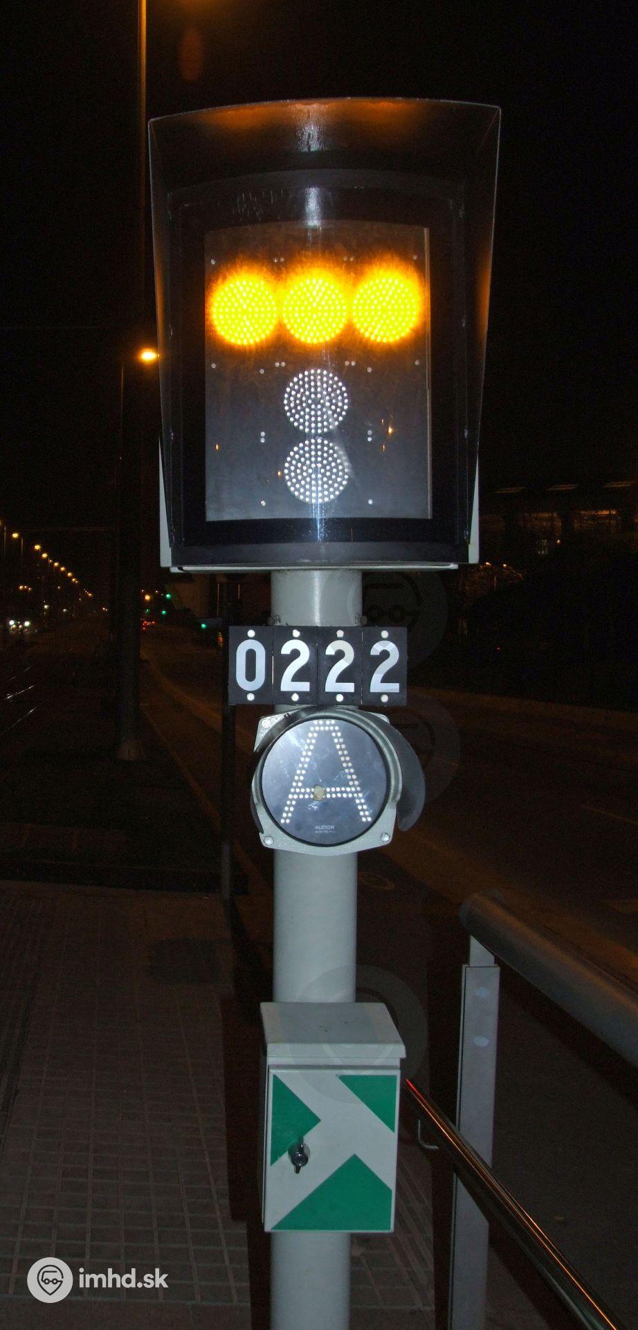 Návestidlo zabraňujúce vstupu električiek do úseku, kde linka T5 prechádza do protismeru. Linka T4 pokračuje ďalej niekoľko zastávok.