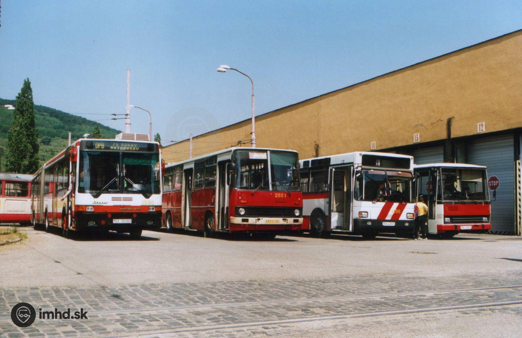 Autobusy Ikarus 435 #1808, Ikarus 280 #2881 (budúce historické vozidlo), TAM-BUS #1408 a Karosa C 744 #1201.