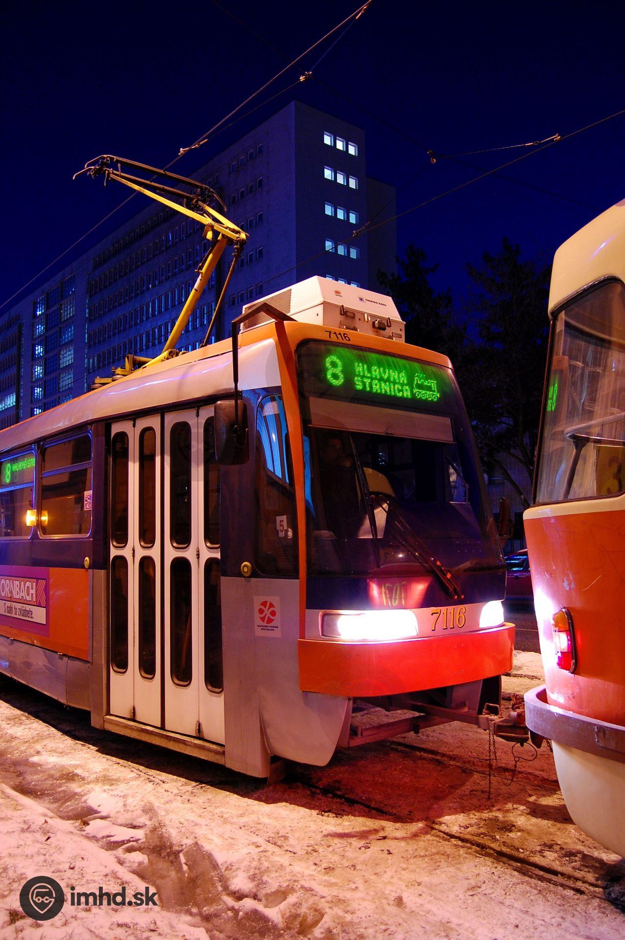 Tatra - ČKD K2S #7116 je pripravená odtlačiť svoju staršiu sestru #7071 na Hlavnú stanicu.