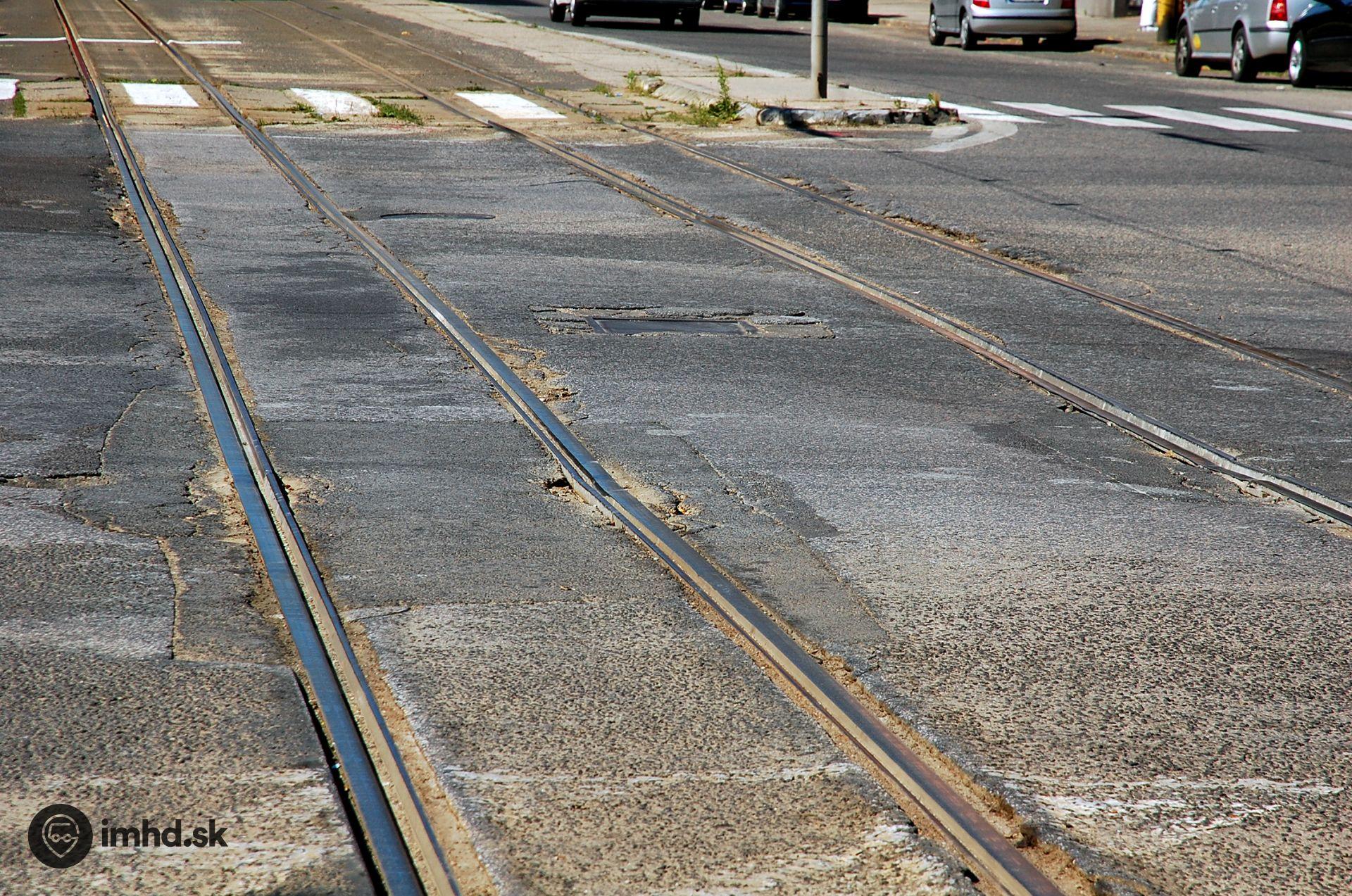 Havarijný stav koľajníc a povrchu vozovky na križovatke Legionárska-Krížna deň pred uzávierkou a rekonštrukciou električkovej trate.