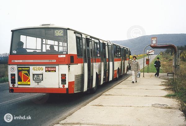 Karosa B 741 #4209/II (ex 2207) vykladá cestujúcich na zastávke Vápencová v čase, keď ešte linka 92 premávala po ceste okolo Devínskej Novej Vsi.