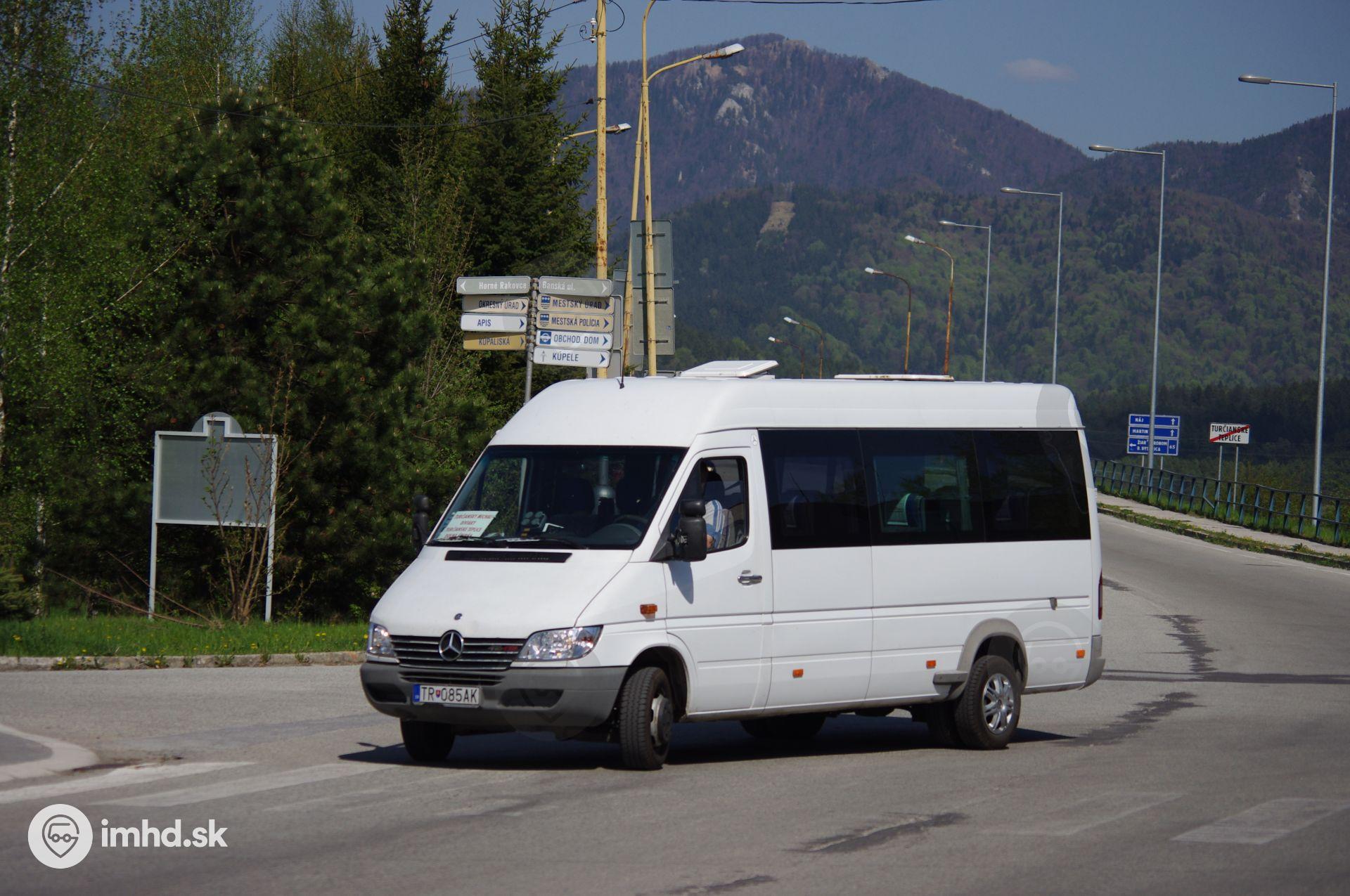 Minibus Mercedes-Benz Sprinter 416 CDI #TR-085AK, jediné vozidlo turčianskoteplickej MHD, odbočuje z Baníckej ulice na Hájsku cestu na verejnom spoji.